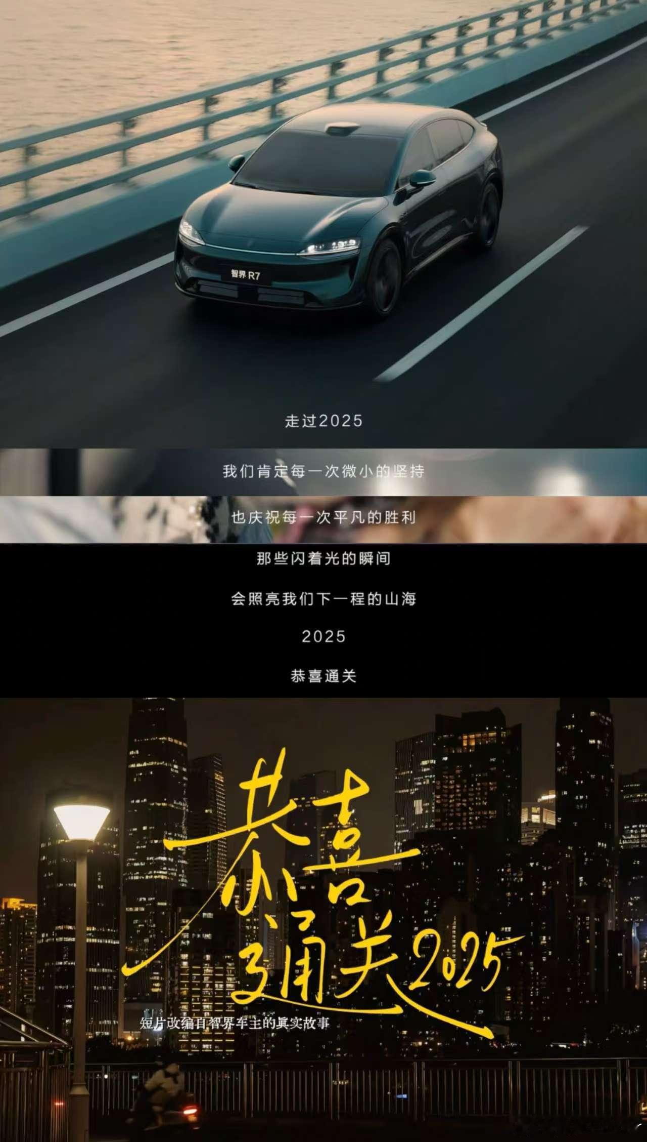 和智界一起通关的2025 近日,智界联合三联生活周刊推出年度暖心大片《恭喜通关2025》。视频通过洞察当代年轻群体的真实情绪,以“肯定自己的每一次成长”为内核,讲述智界陪伴用户经历一年中或高光、或平淡、或低谷的不同成长阶段。智界作为被越来越多年轻人选择的品牌,以超大空间、智能黑科技等实力为底气,化身通关路上的“最强辅助”,在宠物出行、家庭旅行、带娃出门等日常生活场景,从容应对各种需求,而这份贯穿全年的陪伴,更让年轻人在每一次前行中看见自己的成长。这部跨界大片既是智界对社会情绪的精准捕捉,更是智界与年轻人精神共振的生动诠释。智界R7 智界s7