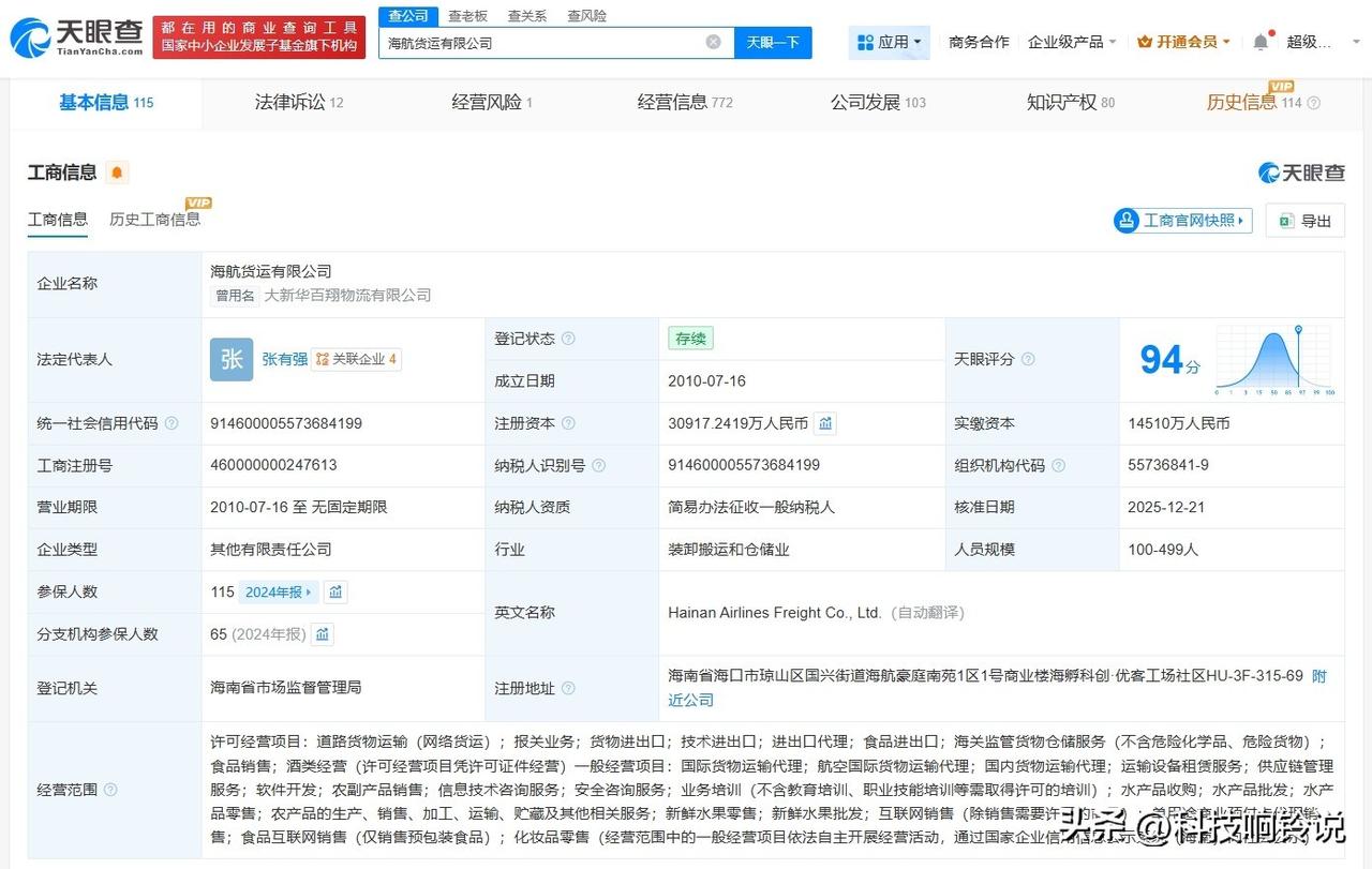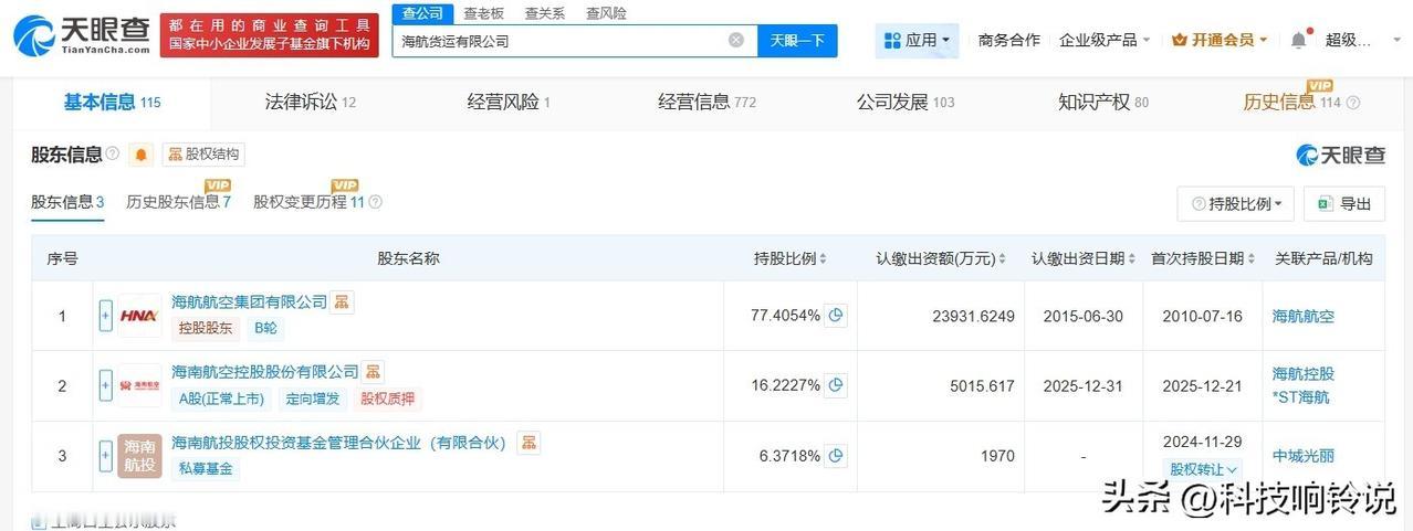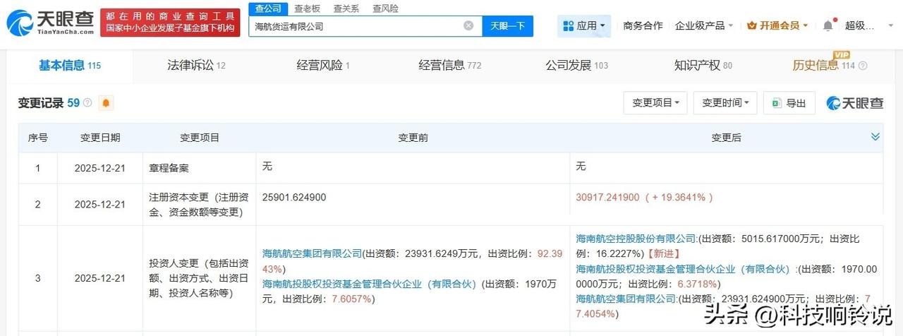 【海航货运公司增资至3.09亿 增幅约19%】 天眼查工商信息显示,近日,海航货运有限公司发生工商变更,新增海南航空控股股份有限公司为股东,注册资本由约2.59亿人民币增至约3.09亿人民币,增幅约19%。 海航货运有限公司成立于2010年7月,法定代表人为张有强,经营范围包括货物进出口、报关业务、进出口代理、供应链管理服务等。股东信息显示,该公司现由海航航空集团有限公司、海南航投股权投资基金管理合伙企业(有限合伙)及上述新增股东共同持股。 天眼查信息: