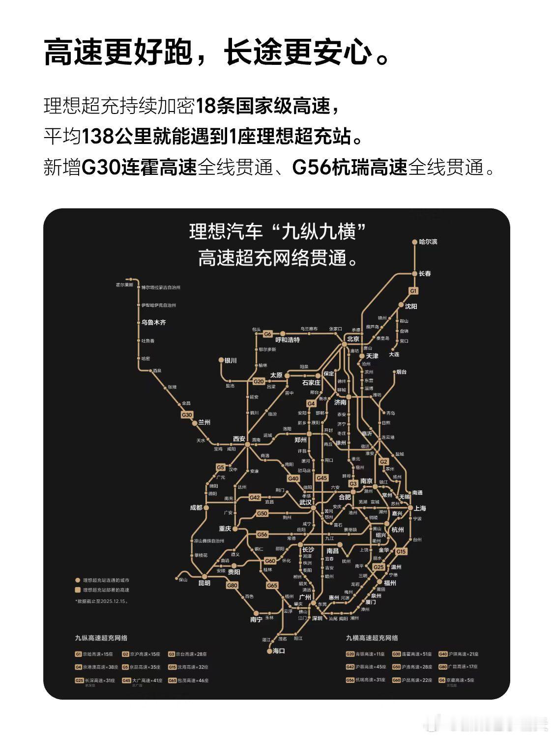 理想在补能建设上,真的很努力!四季度最新进展:➡️功率250kw以上的超充桩来到2万多根,65%以上是超快的4C/5C桩;而且自建超充站3,710座,目前也是车企中最多的。➡️尤其是高速建站一点不含糊。最近新增贯通了G30连霍高速和G56杭瑞高速。18条国家级高速,平均每138公里就有一个站;上次我放假从广州开i8回湖南,尊享5C超充的体验太好了~高端电车光车好不够,自营补能网络保障充电体验很重要!!!理想汽车 2026在高速服务区建超1万个充电枪