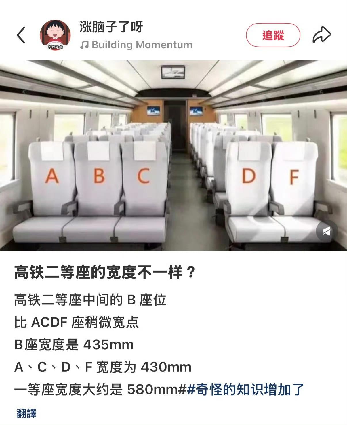 俺刚知道,高铁上b座宽一些! 确实很合理!毕竟b真的很挤… 要让我按照意愿从大到小排序,应该是FDCAB…