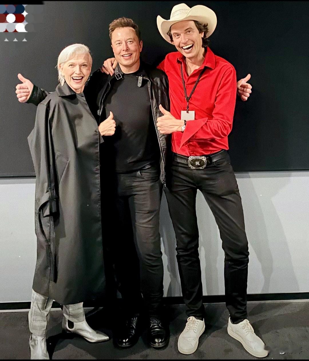 马斯克的母亲梅耶·马斯克,右侧人物是马斯克的弟弟金巴尔·马斯克,特斯拉Cybertruck发布活动现场,母子三人同台是为了庆祝这款电动皮卡的发布,也是马斯克家人对其事业的支持。