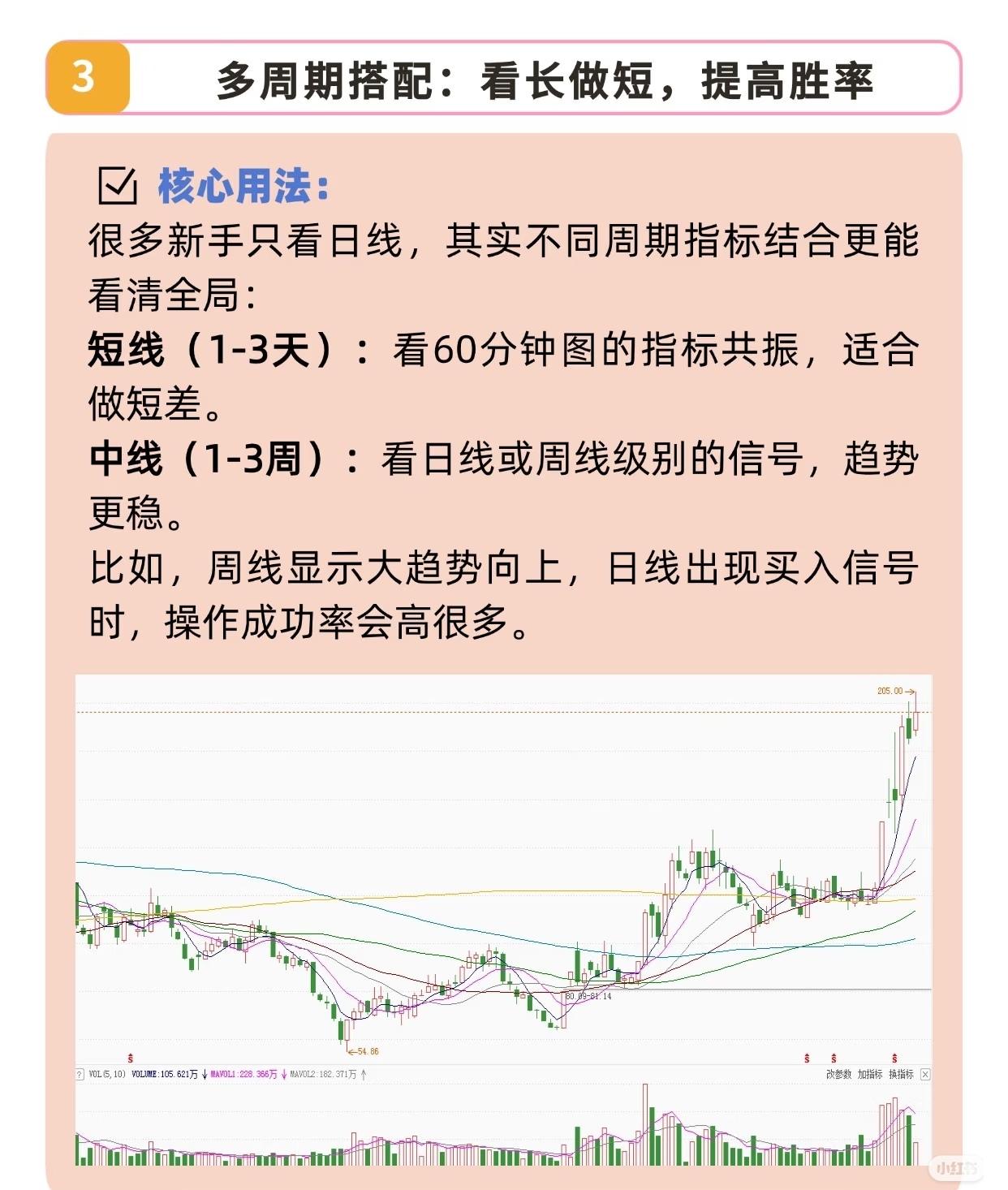 几种实用的股票分析方法及实战关键点。 首先是“三大指标组合拳”,即MACD、BOLL、KDJ共振的分析方法,核心用法为当MACD的DIF在DEA上方且红柱放大(趋势向上)、股价回踩BOLL中轨后反弹(支撑有效)、同时KDJ从20下方金叉并向上发散(节奏转强)时是可靠买入信号,反之则为卖出信号。其次是“中期趋势+量能验证”,通过55日均线(代表中期趋势)与成交量组合判断,当5日均线金叉55日均线且成交量放大30%以上,说明趋势获资金认可、上涨概率大增,若金叉时成交量未放大则需警惕假突破。再者是“多周期搭配:看长做短”,强调不同周期指标结合的重要性,短线(1-3天)参考60分钟图指标,中线(1-3周)关注日线或周线信号,长线(1个月以上)观察月线趋势,比如周线大趋势向上时日线出现买入信号成功率更高。最后是实战关键点总结:一是警惕“假共振”,指标不一致时的“弱势金叉”可能是陷阱;二是仓位跟着信号强度走,强共振可重仓、弱共振轻仓;三是设好止损是生命线,可将止损位设在BOLL中轨下方1-2个点,跌破且指标转弱则果断离场。