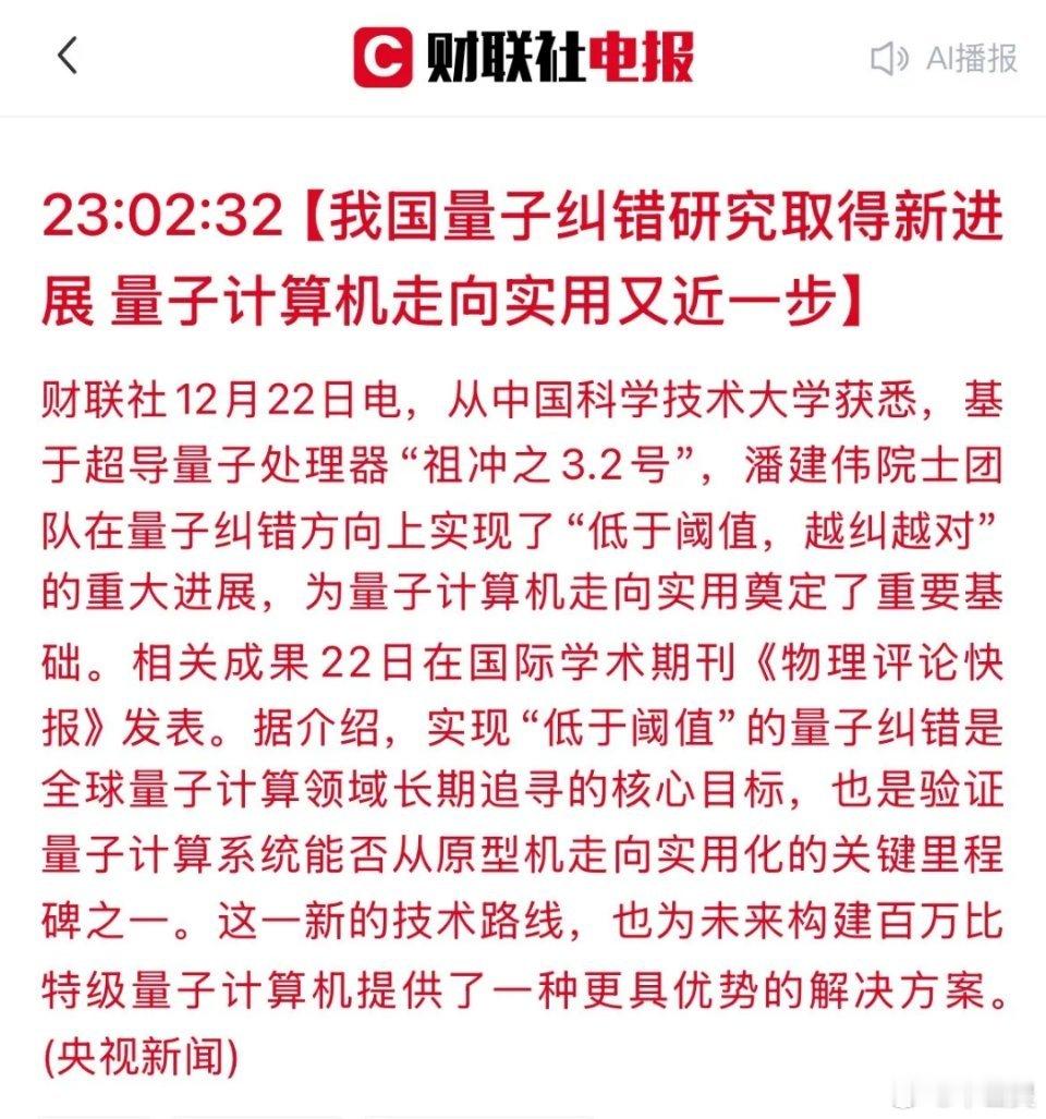 重磅!“量子计算”迎里程碑式突破!“祖冲之3.2号”推动产业化,这些A股公司已深度布局!我国科学技术大学潘建伟院士团队宣布,基于“祖冲之3.2号”量子处理器,在实现“低于阈值”量子纠错的全球核心目标上取得重大进展。这一成果标志着量子计算机icon从实验室原型走向实用的关键障碍被攻克,为构建未来百万比特级量子计算机奠定了坚实基础。技术突破将直接带动产业链发展,多家A股公司已深度布局相关领域。核心受益个股:• 国盾量子:作为“祖冲之”系列量子计算机研制的核心参与企业,在量子计算整机工程化和测控系统领域占据领先地位,是产业化进程中最直接的受益者。• 陕西华达:公司高端电连接器产品已应用于量子通信卫星,是量子信息产业链的关键硬件供应商。• 天融信/雄帝科技:两家公司均在量子密码通信和后量子密码领域进行布局,属于量子安全核心概念股。• 银轮股份:通过产业基金间接参股国盾量子。中国量子计算A股市场股市第一线