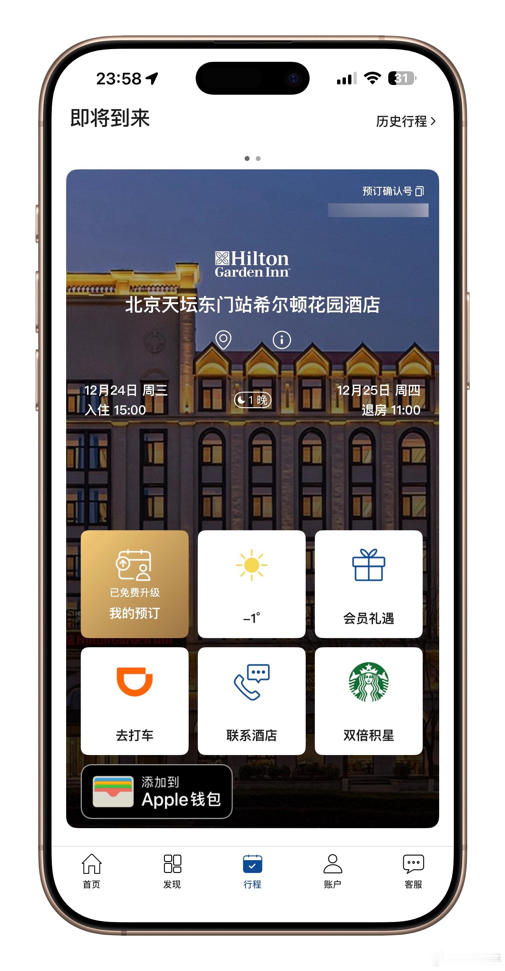 明天去北京!自己定了家 里的 这家花园位置绝了,仅次于华尔道夫 / 王府井希尔顿本来想以生日理由谈心,结果希尔顿系统识别到钻卡,自动升了套房,感觉可以去天坛逛逛,期待了~