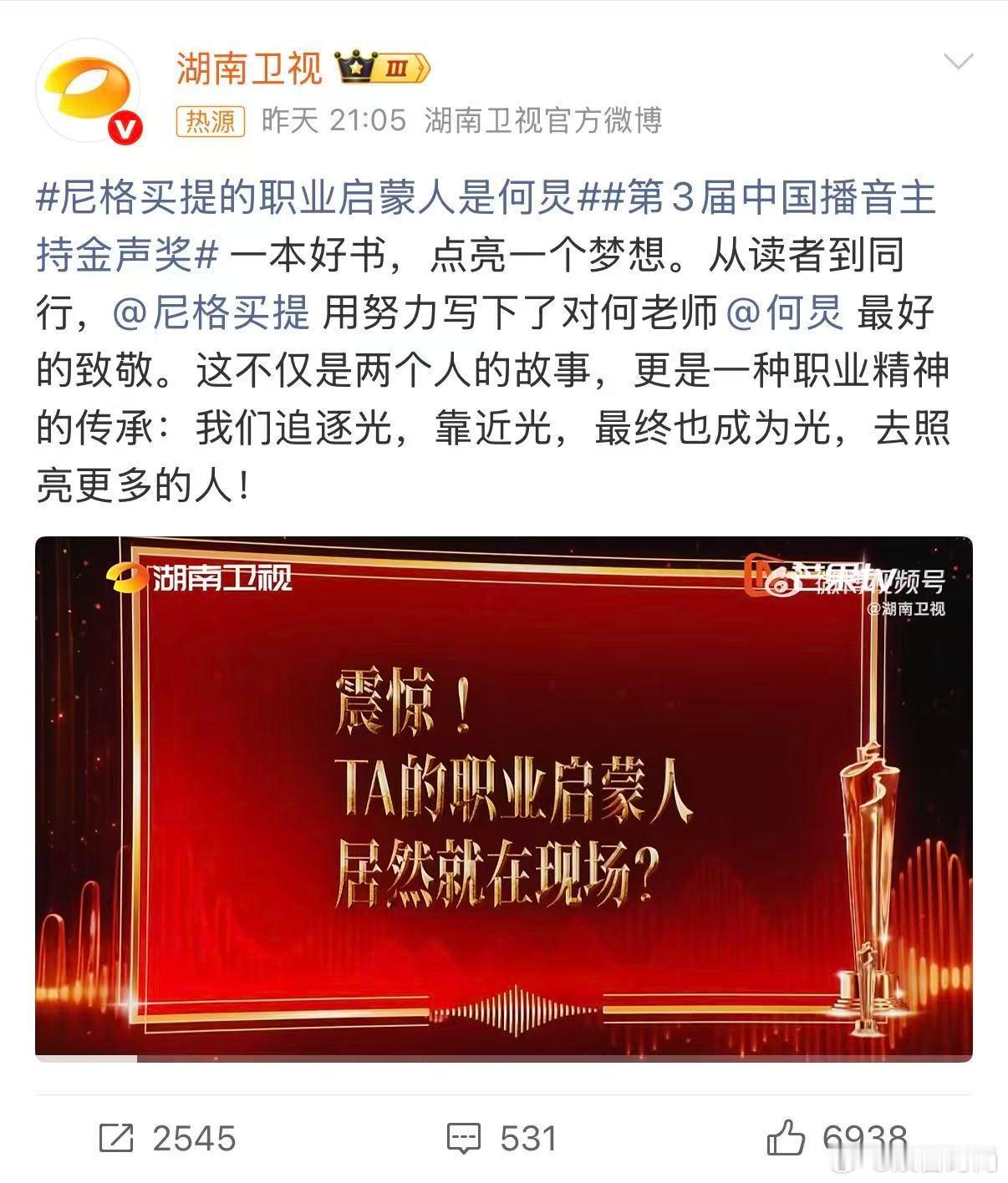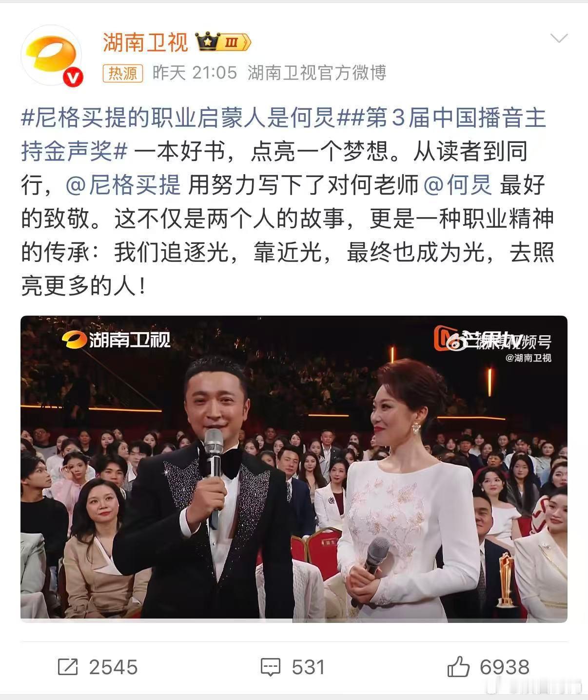 尼格买提的职业启蒙人是何炅第3届中国播音主持金声奖因为遇见光,所以想发光。从读者到同行的蜕变之路,正是对启蒙者最真挚的致敬。这份传承告诉我们:每个追光者,都可能成为下一束光!