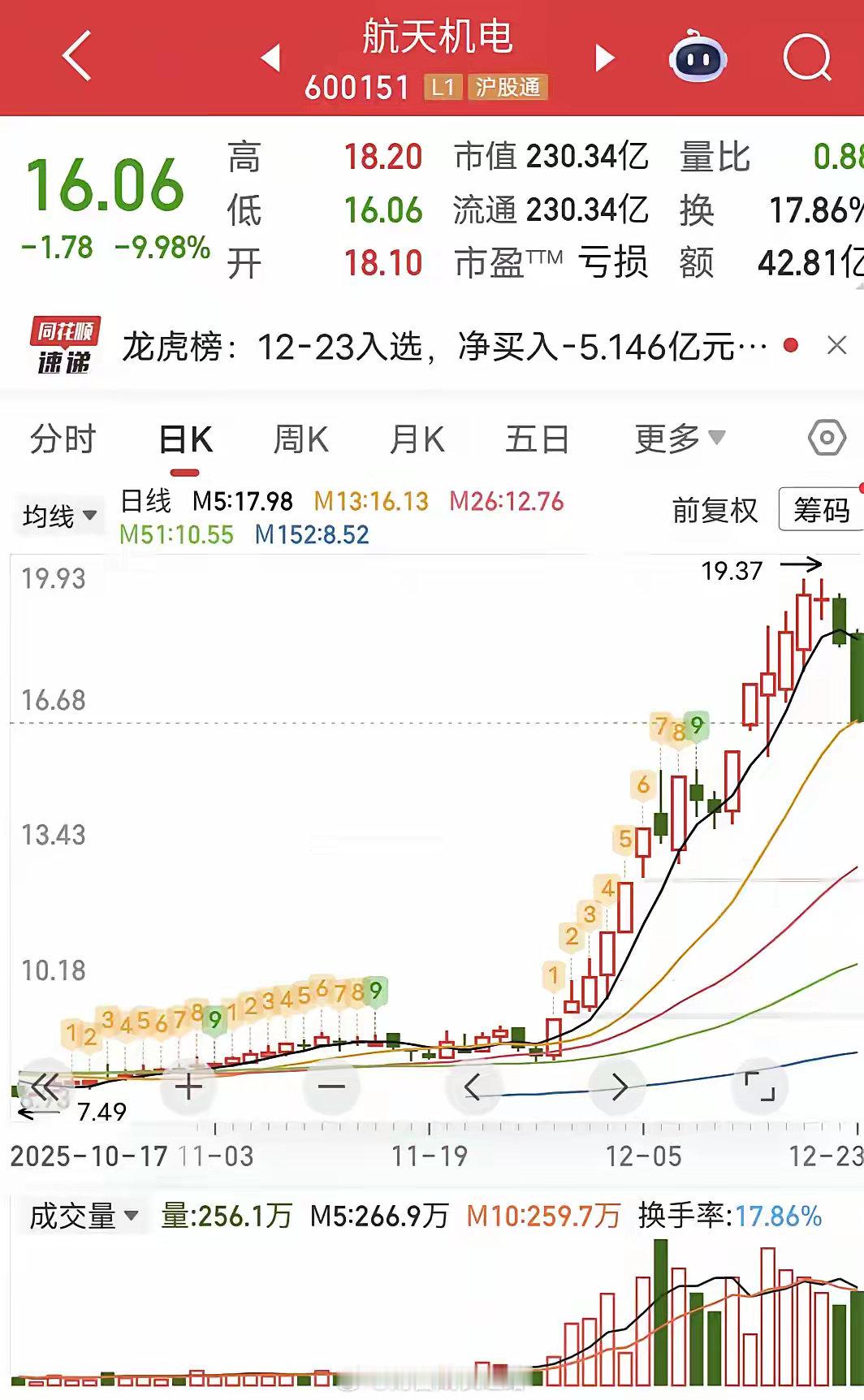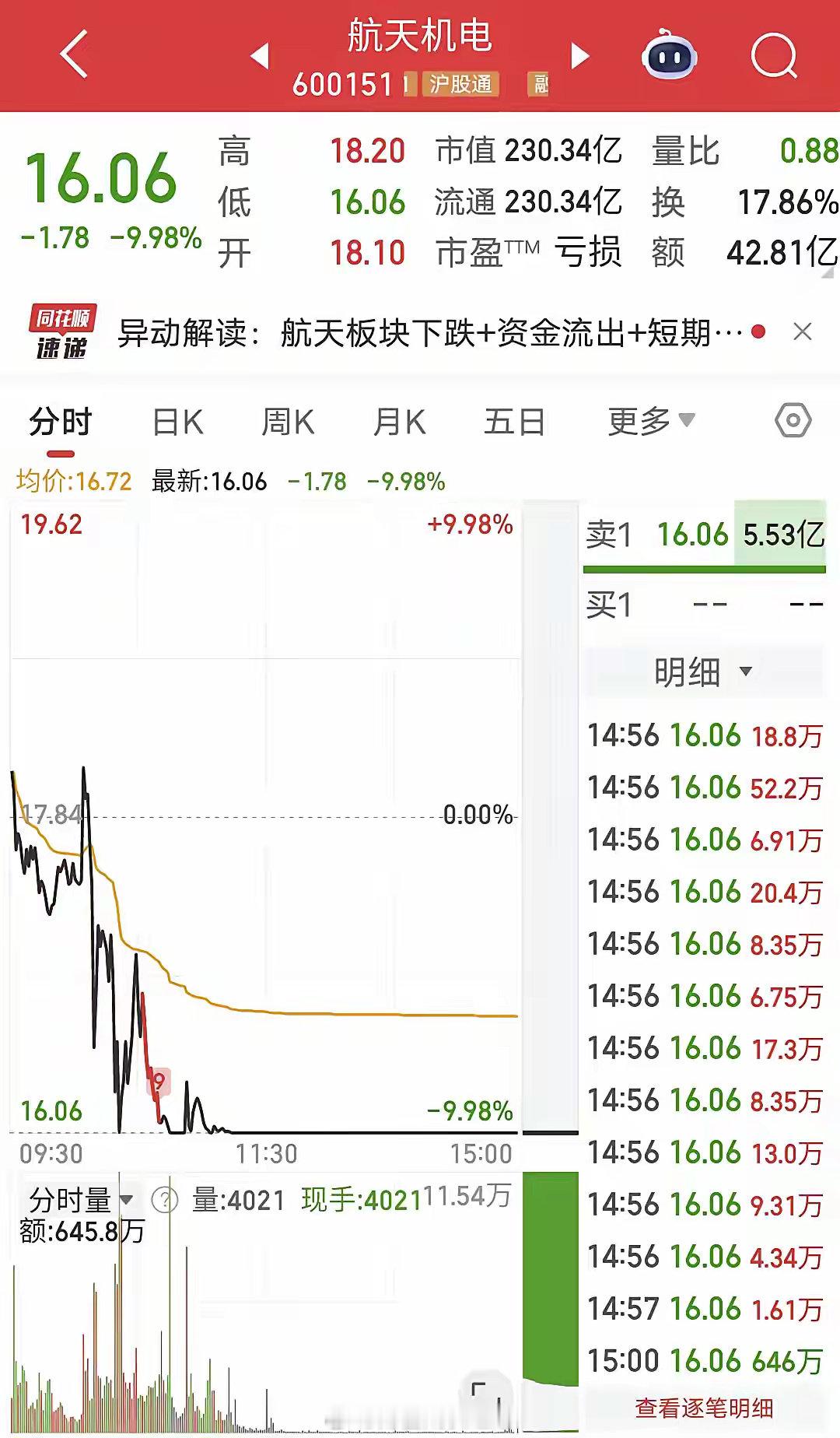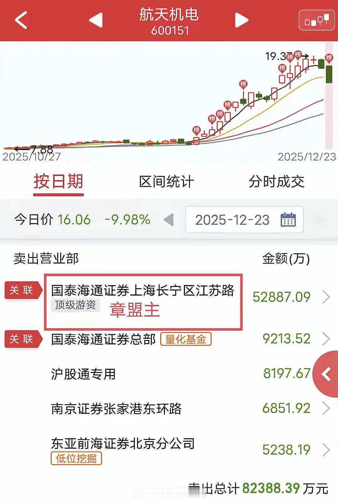 章盟主怒砸5.2亿:今天航天机电开盘快速下跌,最终封死跌停。盘后龙虎榜显示,章盟主暴力出货,怒砸5.2个亿。走的如此坚决,太狠了吧!