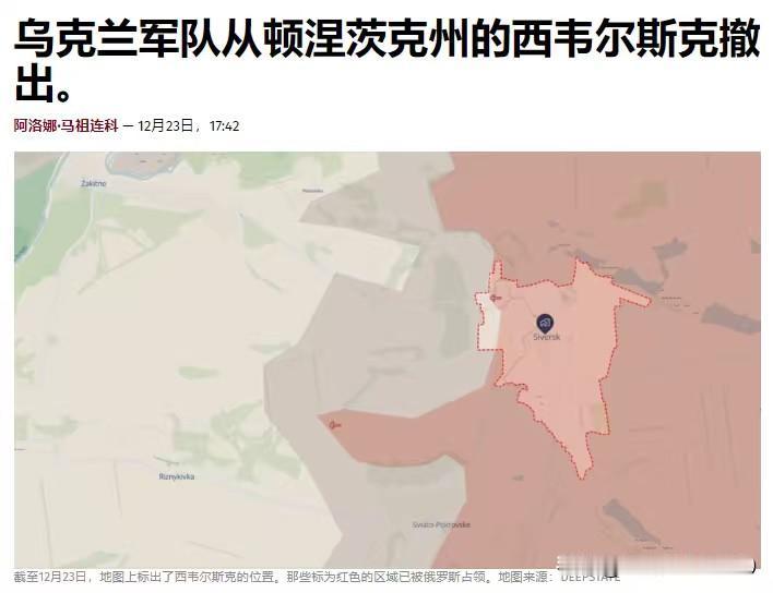 为了我们士兵的生命与作战能力,我们已经从该定居点转移到更有利的位置——乌克兰参谋总部发布声明,乌克兰军队已经从顿涅茨克州的谢韦尔斯克撤出。 据乌克兰参谋总部的消息称,在该地区,俄罗斯军队在人力和装备方面拥有明显优势,因此仍在继续发动攻势。 消息称,在谢韦尔斯克附近,激烈的战斗仍在持续。俄罗斯在人力和装备方面拥有明显优势,他们仍继续开展积极的进攻行动。 为保护我军士兵的生命以及保障部队的作战能力,乌克兰守军已经从该定居点撤出。 乌克兰总参谋部表示,由于俄军在兵力上占据优势,再加上在恶劣天气条件下,小规模突击部队不断施加压力,因此俄军得以向前推进。 但乌克兰总参谋部还表示,谢韦尔斯克仍然处于乌克兰军队的火力控制范围内。并强调,驻扎在该城市的占领军将会被击败,他们的后勤补给线也会被切断。同时,他们的部队会遭到封锁,以阻止他们继续前进。 值得注意的是,俄罗斯军队发起对谢韦尔斯克的进攻,仅仅用了26天,便解放了乌军坚守的这座被视为乌克兰东部的堡垒城市,尽管此后乌军仍强调乌克兰军队仍控制着该市的西部。 而如今,乌军彻底放弃了该城市,谢韦尔斯克的解放,对俄罗斯军队具有重要意义,这被视为俄军敲开顿涅茨克另外两座城市:克拉马托尔斯克,斯洛维扬斯克门口的大门。为未来对这两座城市发动攻势打下坚实基础。