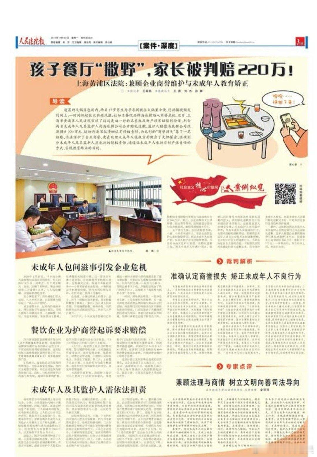 海底捞小便事件家长赔220万 震惊!两名17岁男生凌晨在海底捞包间聚餐时,为寻求刺激竟往沸腾火锅里小便,还互相拍摄视频传播至网络。视频扩散后引发轩然大波,网友纷纷质疑品牌食品安全与环境,导致海底捞多地门店客流锐减、口碑断崖式下跌。为挽回商誉,涉事门店更换全部餐具、彻底清洗消毒,还对相关时段4109单消费全额退款。近日上海黄浦区法院审结此案,认定两名未成年人构成共同侵权,判令其与监护人公开赔礼道歉,监护人需赔偿餐具损耗、商誉损失及维权开支等共计220万元。法律既守住了企业合法权益,也通过明确责任为未成年人上了一堂深刻的规则课!
