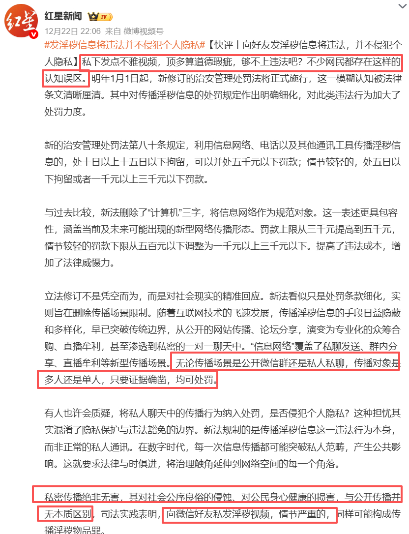 发淫秽信息将违法并不侵犯个人隐私最核心关键在于,如何解释“情侣/夫妻等亲密关系间互发”的问题,按照这家媒体评论:「需要摒弃“私下传播无责”的错误认知」。「私密传播绝非无害,其对社会公序良俗的侵蚀、对公民身心健康的损害,与公开传播并无本质区别」。显然是把所有1对1关系都纳入其中。对微信群、QQ群等规模性的进行限制,对付费谋利性的进行管控,都合情合理且多数能理解。但小两口搞点小情趣之间,即便范围和内容都仅在两人之间,同样会触发条款,而且对亲密关系之间的传播管控,实际如何执行落地?是让互联网平台加强对好友间私聊颜色内容的AI或人工审核,还是让私聊双方其中一方主动检举揭发另一方,都是需要解答的问题。擦边涉黄别再抱有侥幸心理别让软色情躲在模糊地带