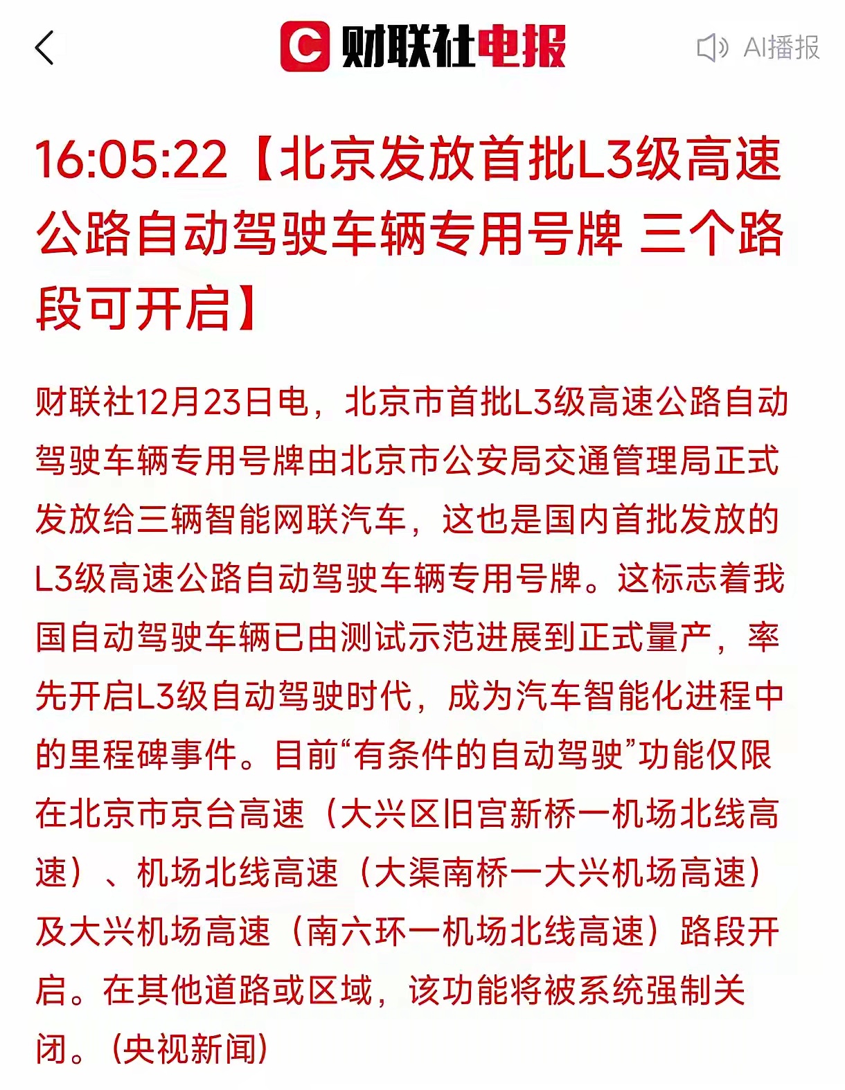 自动驾驶板块突发重磅利好!12月23号北京正式宣布发放首批L3级高速公路自动驾驶车辆专用号牌!以后在三个路段可以合法开启L3自动驾驶,这是巨大的突破!从宣布进行测试到实际商业化落地,太快了,进度超市场预期。利好获得准入许可和牌照的整车企业,对整个产业链也起到带动作用,为其他地区加速普及L3打好了基础,意义重大!以后随着相关法规的完善和技术进步,自动驾驶将成为决定消费者买车的重要因素,那些技术落后的公司和产品,将会在市场里面逐渐边缘化甚至消失。电动车的下半场是智能化,这点是大势所趋。