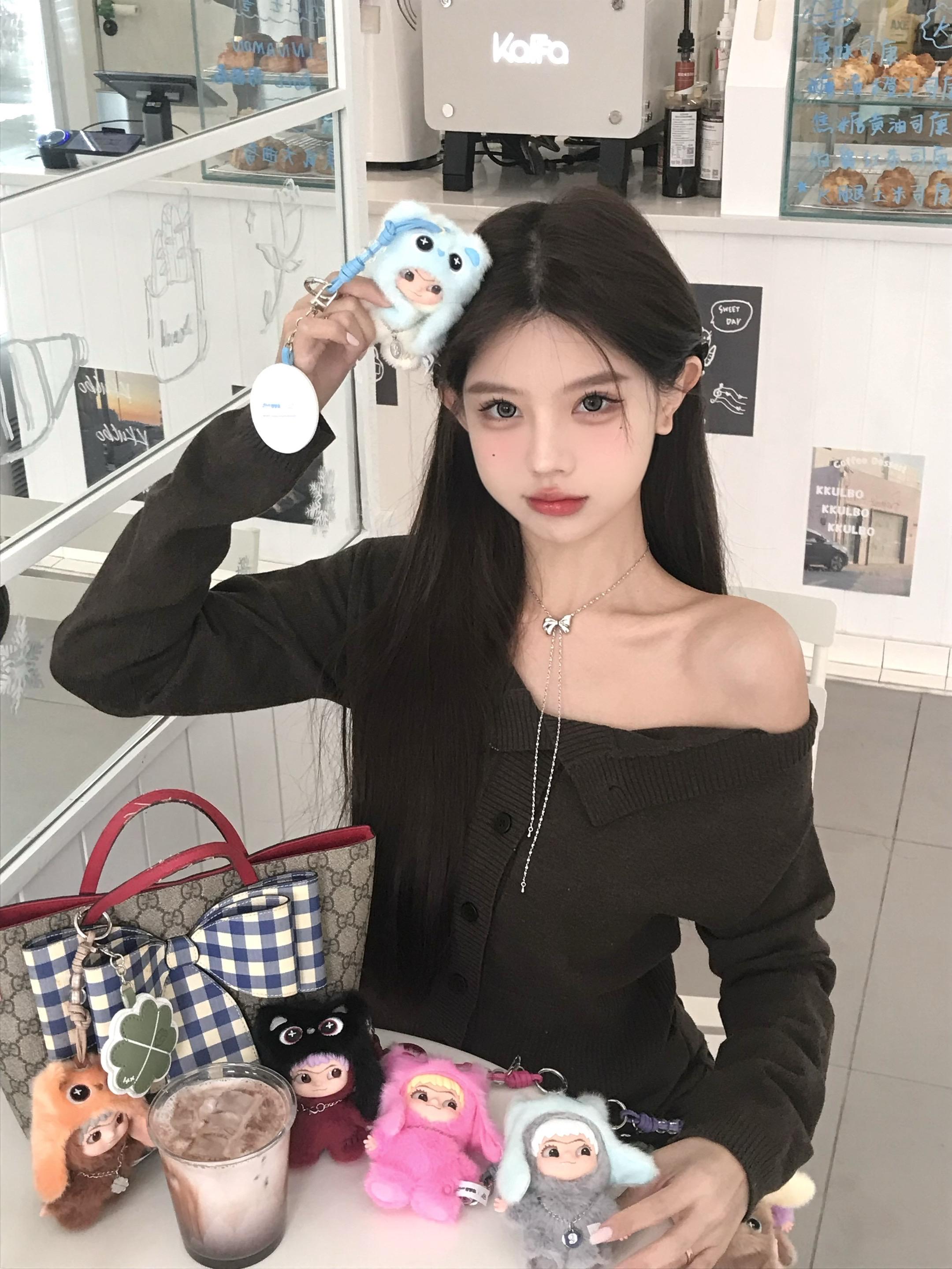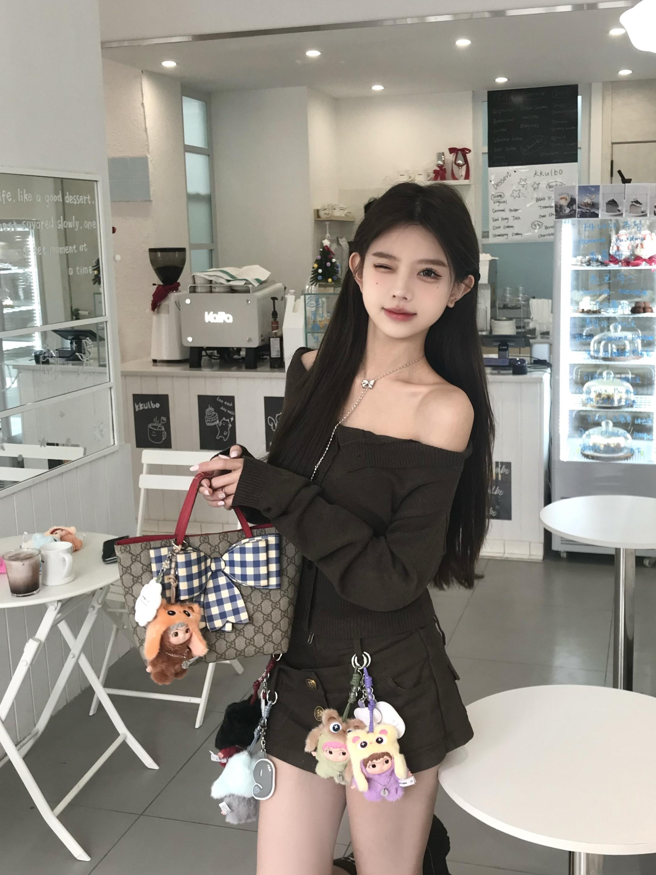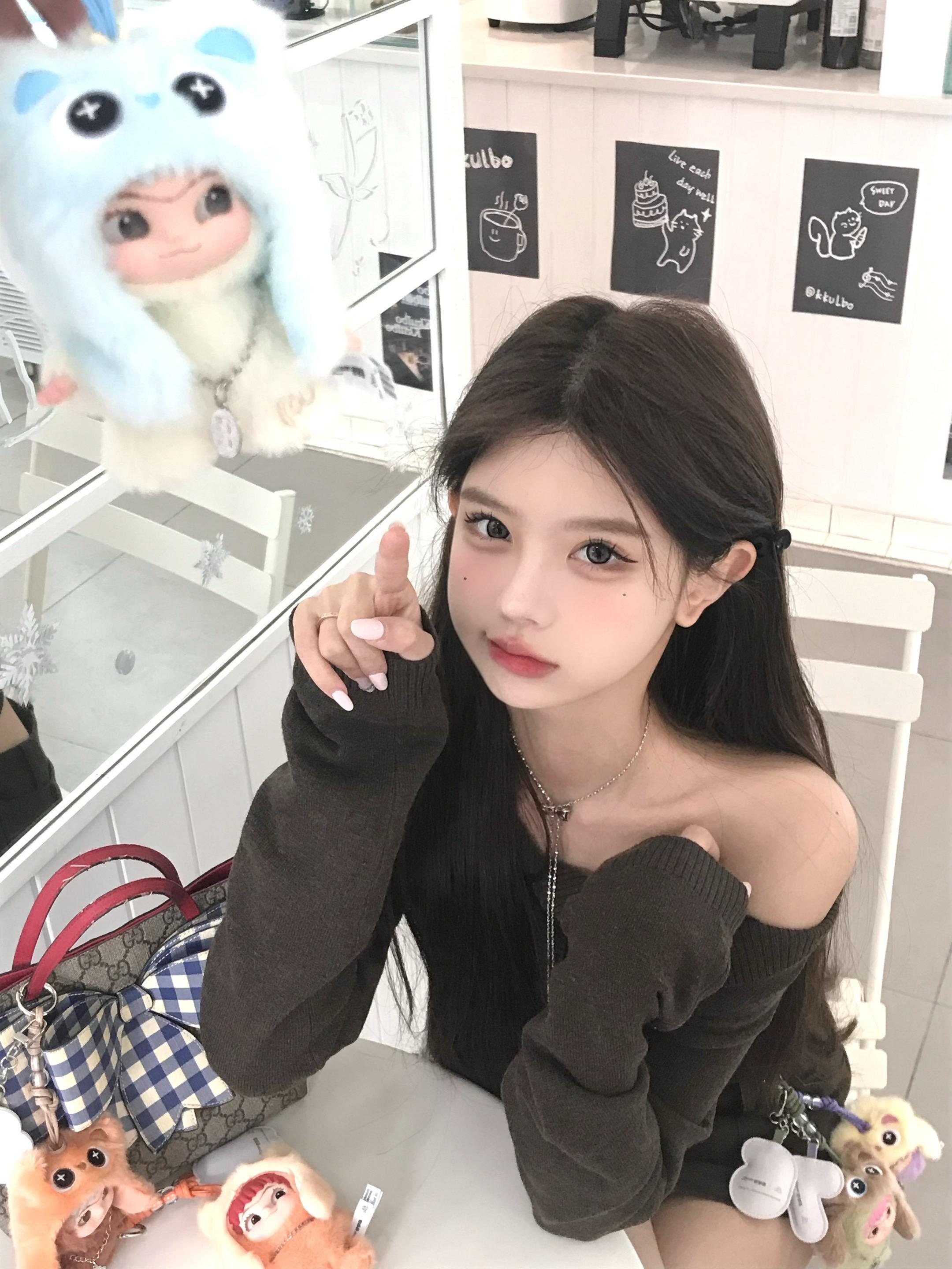 一位长相漂亮、身材出众的姑娘,穿上了一件对身材要求极高的紧身款一字肩粉色针织衫搭