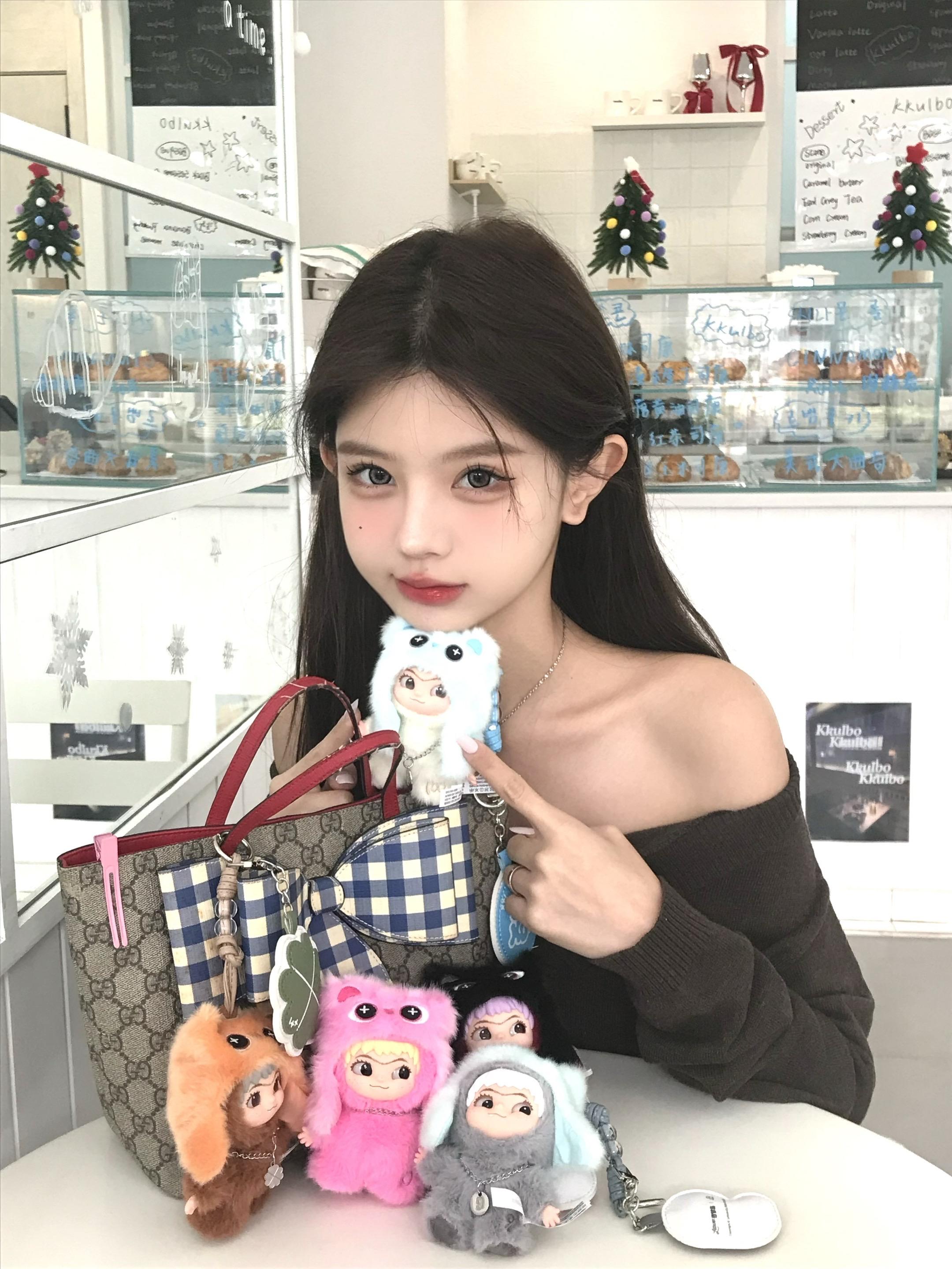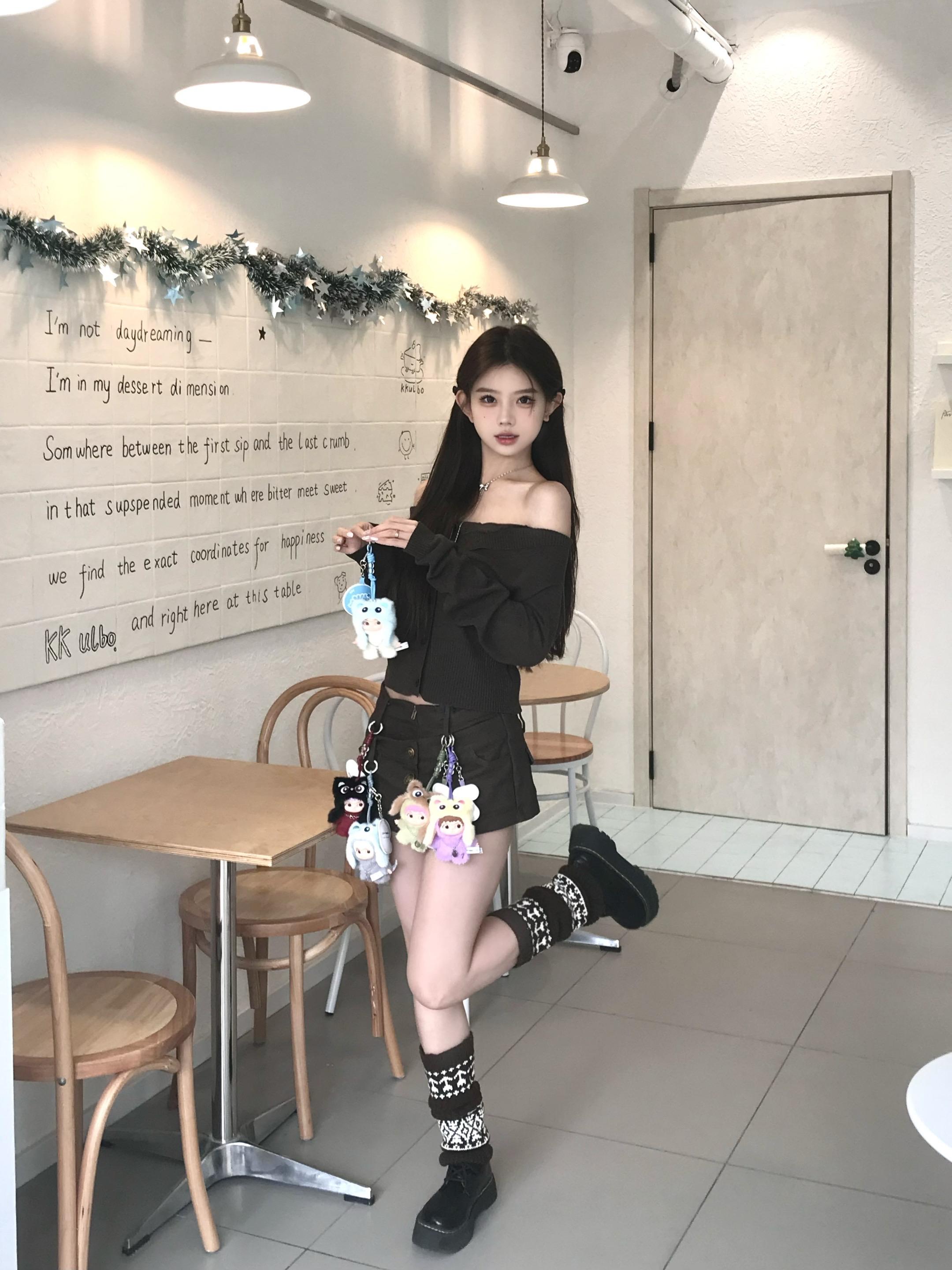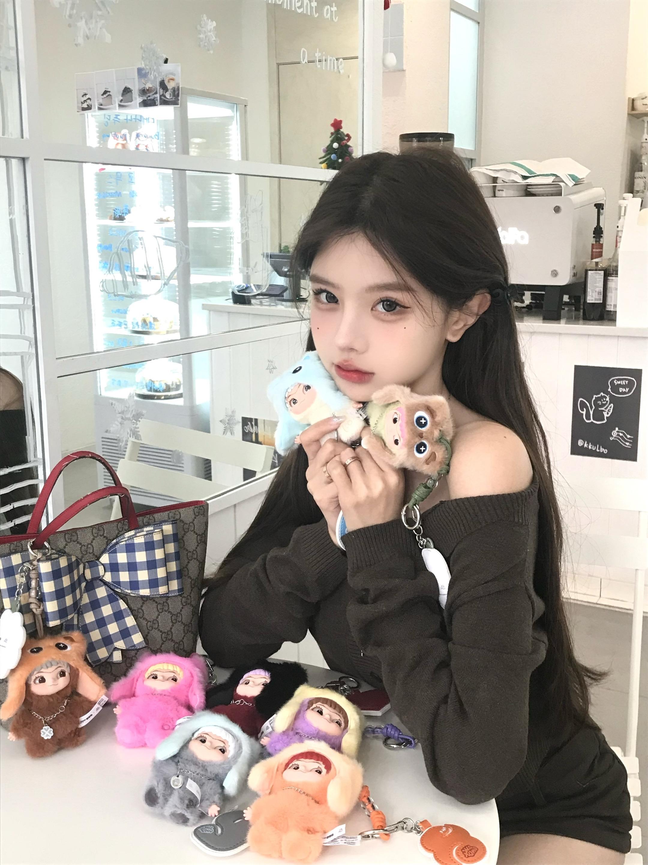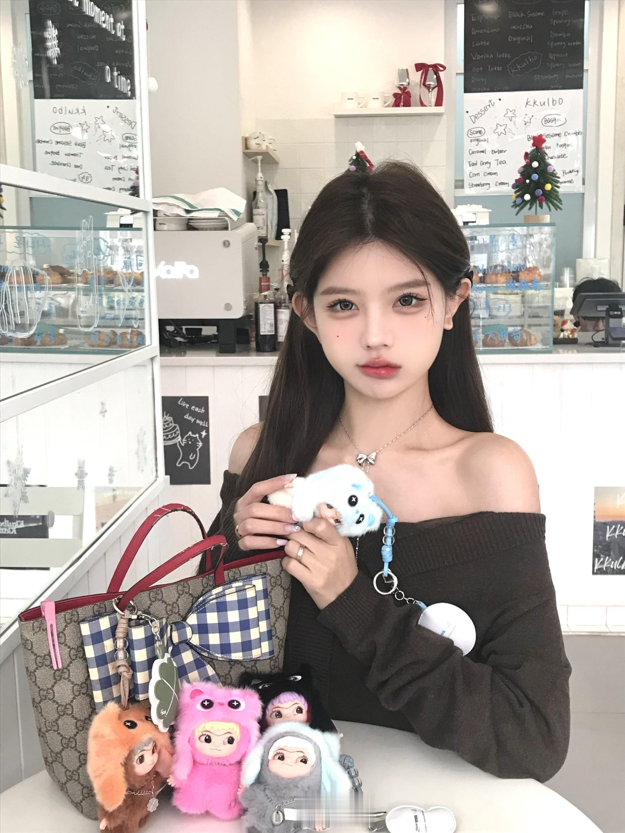 一位长相漂亮、身材出众的姑娘,穿上了一件对身材要求极高的紧身款一字肩粉色针织衫搭