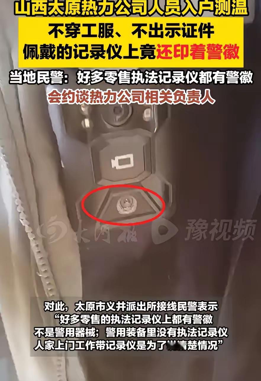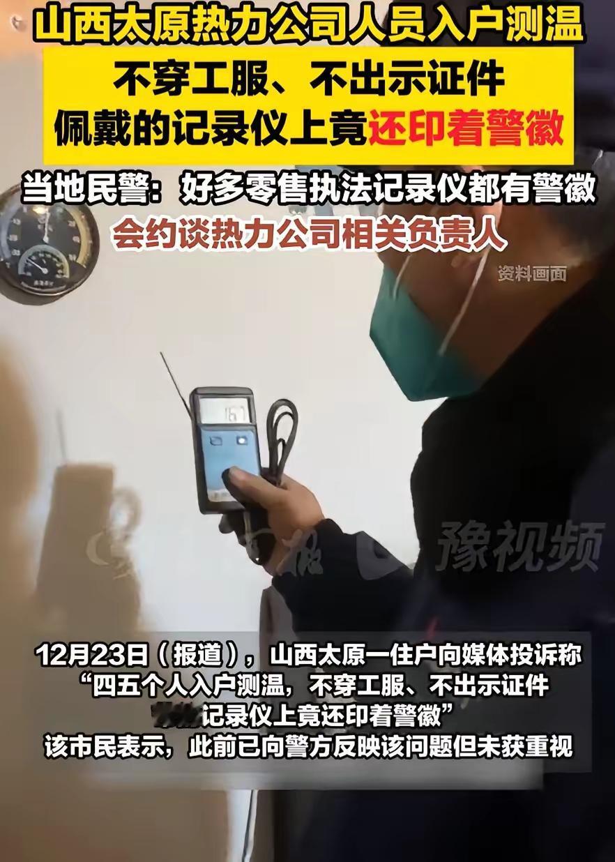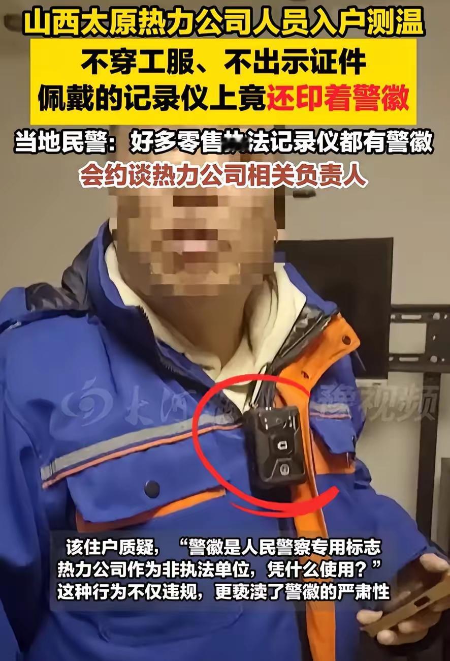 这下闹大了!山西太原,男子家里温度低于18度,就向热力公司投诉,没想到,工作人员偏偏等到中午上门,而且专测阳面的房子,正当男子提出质疑时,他又发现了另外一个问题,上门的工作人员佩戴的记录仪上面还印有警徽,男子不表示无法理解 男子住的小区供暖多年不达标,140平的房子里,阴面卧室常年只有十几度,暖气片摸起来凉飕飕,温度计稳稳停在17.5℃,离规定的18℃还差着一截。 忍无可忍投诉后,热力公司倒是来了人,可四五个人进门没穿工服,也没出示证件,鞋套都不换就往里闯。 更蹊跷的是,他们专挑中午太阳最毒的时候上门,直奔阳面房间测温,测出20℃就催着签字,对阴面的冷屋子绝口不提,连查供暖进出水温都被拒绝。 争执间,男子瞥见其中一人胸前的记录仪,上面竟赫然印着警徽。这一下,他的火气更盛了:热力公司是企业,凭什么用警用标志? 按规定,警徽是人民警察专用,任何单位和个人不得擅自使用,这可不是小事。男子两次追问设备来源,对方要么沉默,要么只含糊说自己是热力公司的。 这事发到网上,立马炸了锅。网友们纷纷吐槽,自家也遇过类似的"选择性测温",专捡暖和的时候和地方测,根本不反映真实情况。 更让人费解的是,这带警徽的记录仪竟是公安系统集中采购的型号,热力公司到底是怎么拿到的?是违规购买还是另有隐情? 律师说得明白,这种行为已经涉嫌违法,严重的可能面临拘留和罚款。供暖本是民生大事,测温该门窗关严一小时后,在房间中心实测,而非如此敷衍。 当地警方虽回应会约谈负责人,但热力公司至今没给出任何解释。警徽代表着公信,供暖连着民心,如此糊弄事、越界使用警用标识,寒的是老百姓的心。 民生服务容不得半点猫腻,测温要公开透明,标识不能乱用。希望相关部门好好查查,给个明明白白的说法,让住户既能暖身,也能暖心