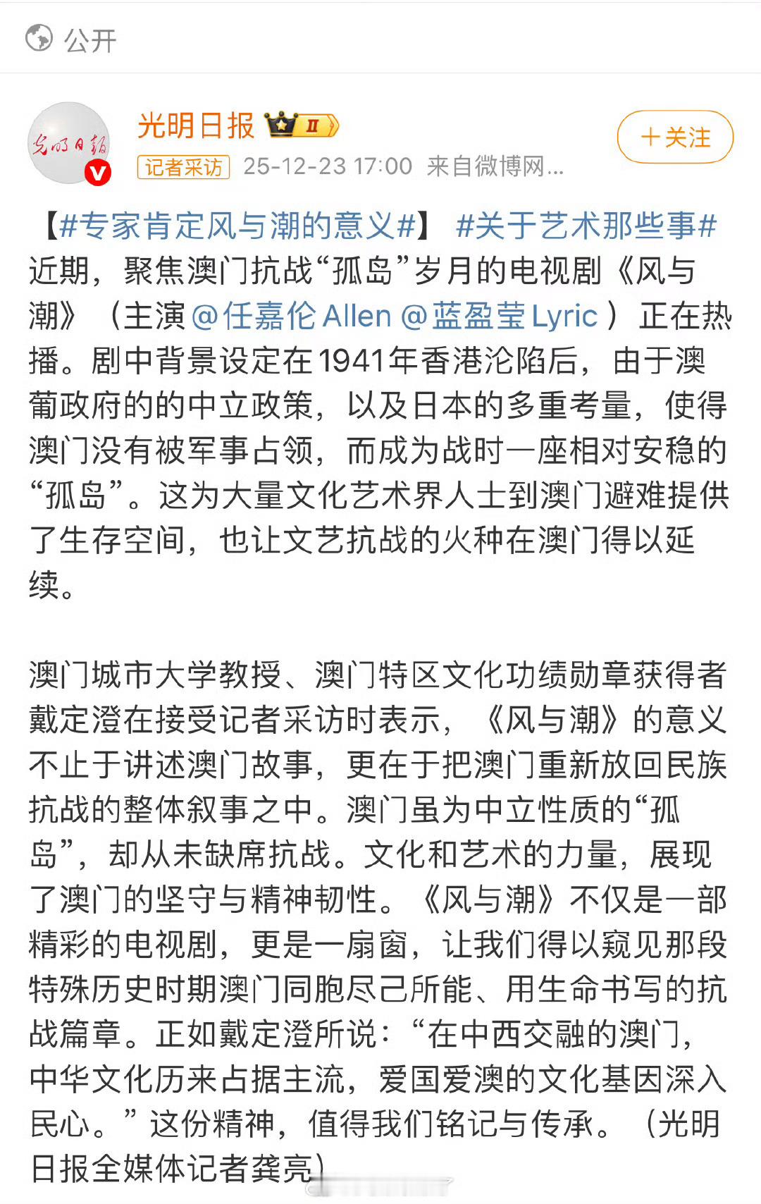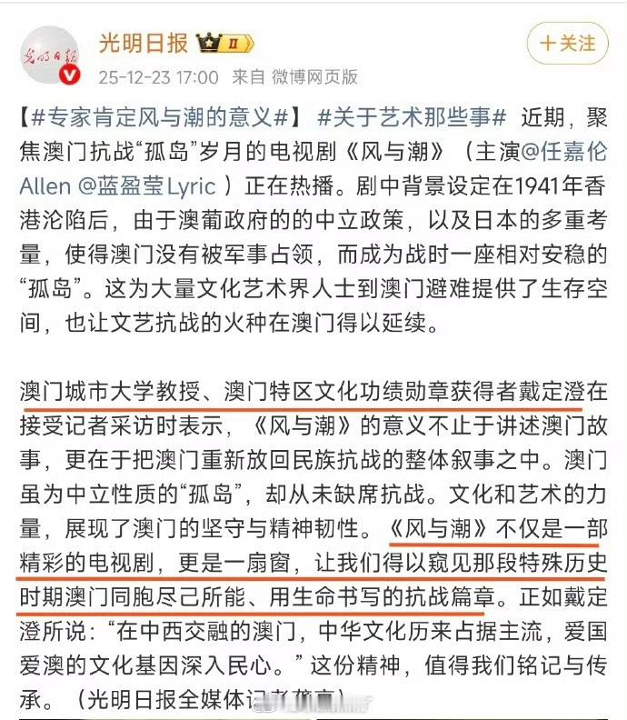 专家盛赞《风与潮》历史意义。这评价真的点到精髓了既有历史厚度又有情感分量。扎实的结构、密不透风的情节,织出风声鹤唳的时代质感;每一个人物都有筋骨、有来路,表演克制却有力量,风与潮是一部不可多得的优秀艺术作品,可看性极高!任嘉伦何贤这个角色贵在担当,嘉伦把历史演得有温度、有重量,很服气嘉伦出演真实人物何贤,形象高度契合,演技稳准狠,撑起整部剧的精神内核