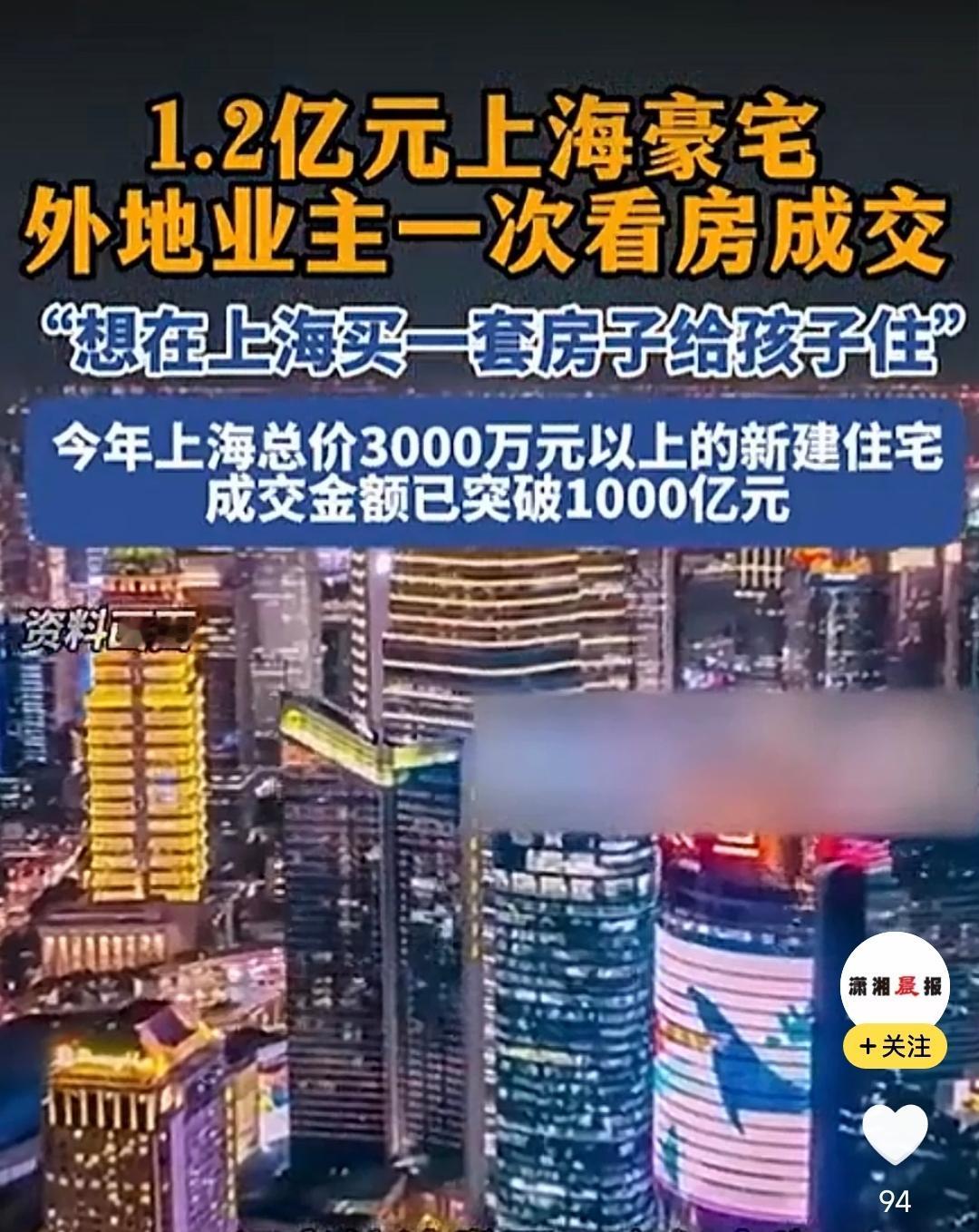 真是“豪无人性”啊!外地业主到上海花1.2亿买豪宅只为了给孩子住,真是贫穷限制了想象。 谁还在说楼市遇冷?看看上海的豪宅市场,有钱人直接用真金白银刷新普通人的认知! 一外地企业主,只去看了一次就当场拍板,豪掷1.2亿拿下江景顶复,一句只为给孩子在上海有地方住,直言“要买就买最好的” 。这波操作让网友直呼“这样的父母上哪找”? 就在今年,上海3000万以上豪宅成交金额已突破1000亿元,更震撼的是,相比之下,北京、广州、深圳三大一线城市同级别豪宅的成交总和全加在一起,才够得上一个上海。 在全国30个重点城市的高端住宅成交中,上海一地就占了近六成的份额,金陵华庭项目更是创下3小时售罄揽金92亿的纪录,二期开盘再售罄,销售额近百亿。 有意思的是,这些天价房源的买家大多数都是外地业主居多。数据显示,上海高端项目中,非沪籍买家占比超过了七成。也就是说,上海每卖10套豪宅,有7套都是外地业主拿下的。 而他们看中的,可不仅仅是上海的繁华和迷人的江景,更是上海不可复制的教育资源、医疗配套和资产避险功能。 更扎心的是,一边是普通楼市持续低迷,另一边则是顶级豪宅的抢房大战,这“冰火两重天”的景象,不仅揭示了当前中国财富分布的现实,更预示着一线城市资产重估的大趋势。 当普通人还在为首付奔波,而有钱人豪掷1.2亿只为给孩子安个家。这不仅是贫穷限制了想象,更是让咱们看到一种难以跨越的距离。 还能说啥,普通人,加倍努力吧……