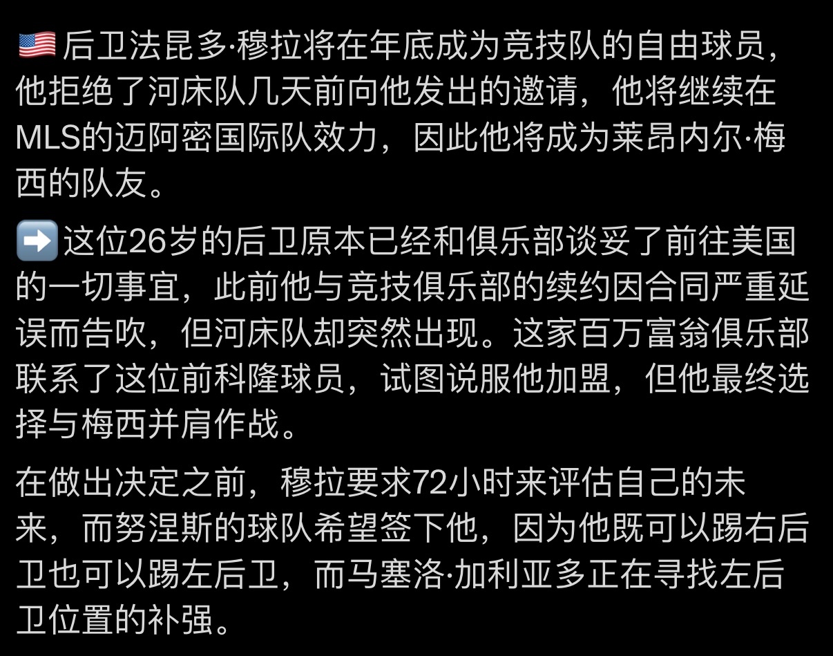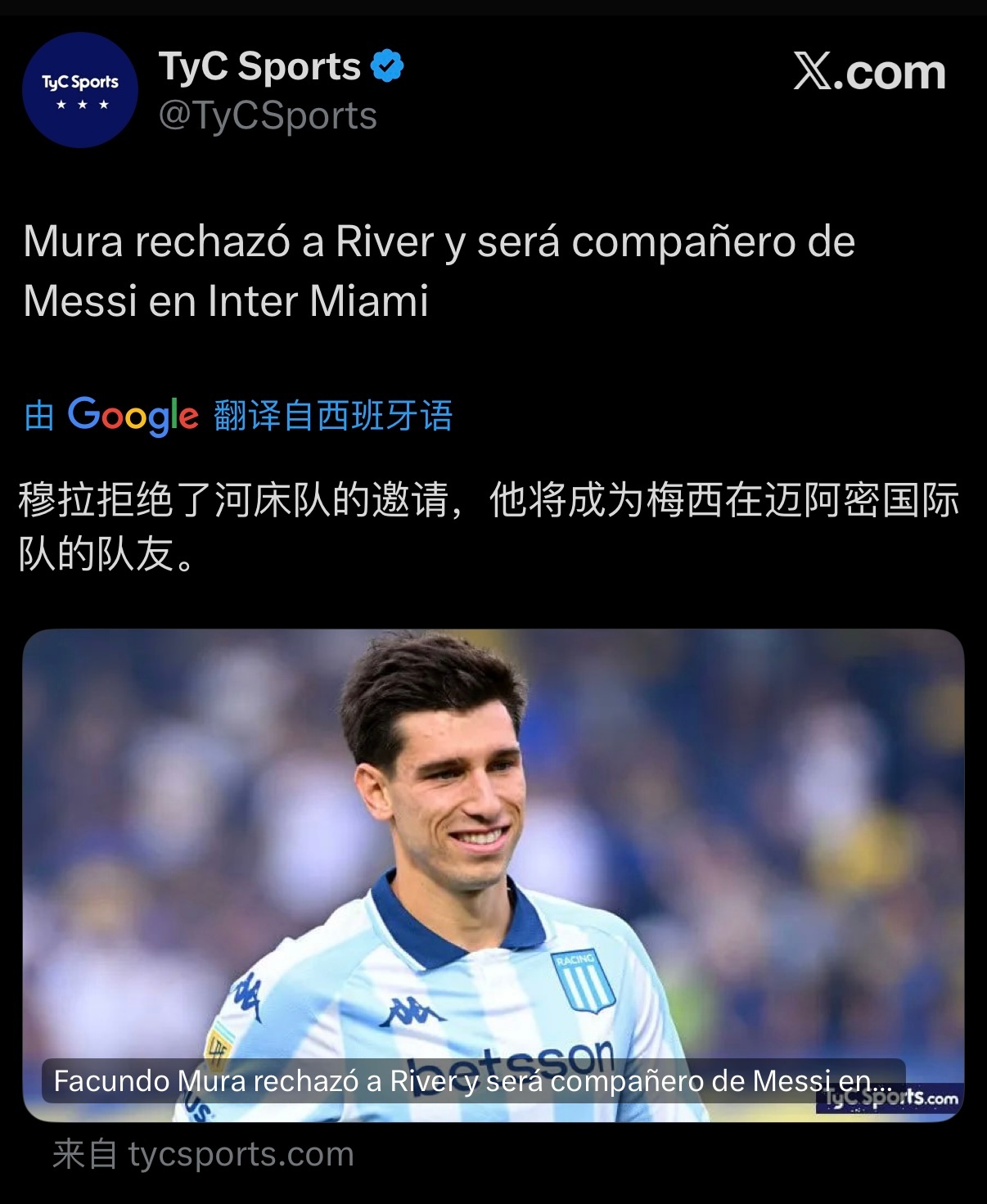 转会记者|法昆多·穆拉(Facundo Mura)婉拒河床队,打算加盟迈阿密国际。TyC也报道了此条新闻。迈阿密国际