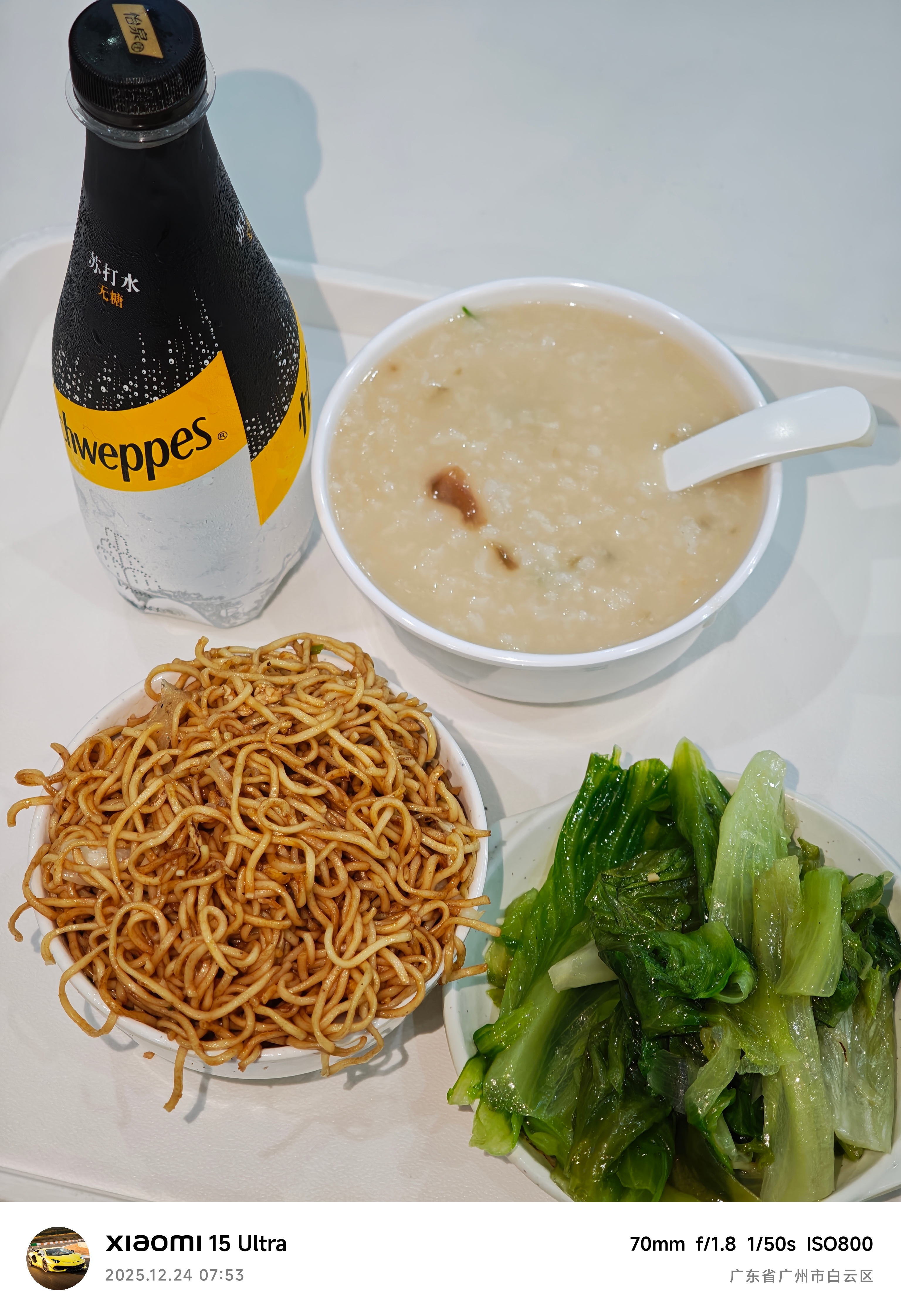 朋友们早啊,今天来广州了~ 早餐吃皮蛋瘦肉粥 + 炒面 + 生菜,很丰盛!