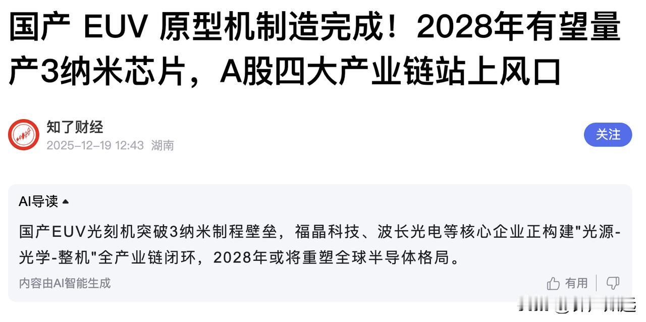 光刻机要突破了,又有人说光刻胶! 刚刷到国产光刻机有进展的消息,评论区立马有人补刀:“别光看机器,光刻胶才是关键”。 确实,光刻机是 “画笔”,光刻胶就是 “墨水”,没有合格的胶,再先进的机器也白搭。 全球 90% 以上的高端光刻胶都被日本企业攥着,咱们之前连 28nm 用的 ArF 光刻胶都得全靠进口。 更头疼的是这东西保质期就几个月,想囤货都没法囤,真断供了晶圆厂可能一个月内就得停摆。 不过咱们也不是没有准备。 最近南大光电的 ArF 光刻胶已经实现 50 吨量产,还稳定供货中芯国际了。 兴福电子也收购了核心技术,从上游材料端破局。 虽然 7nm 以下的 EUV 光刻胶还在攻关,但至少成熟制程不用再看别人脸色。 而且日本也不敢用光刻胶说事,因为没有中国的原料他们连装光刻胶的瓶子都造不出来。 光刻机和光刻胶就像两条腿,缺哪个都走不快。 现在一条腿在加速,另一条也跟上了,这才是真的有盼头。日本中国光刻技术 极紫外光刻技术