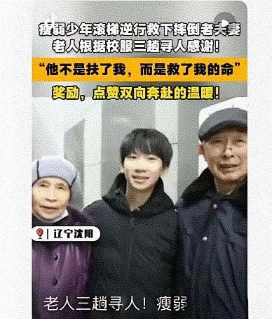 “不是扶了一下!”辽宁沈阳,八旬老两口出地铁站时不慎滚落电梯,一名初三男孩迅速逆行冲下将其扶起。老人被扶起后,却说什么也不让男孩走。 沈阳的冬日里,总有些事能戳破寒意,比暖气更暖人——地铁扶梯上的一场逆行,竟成了两个世代的善意照面。 12月11日的泉园站,八旬的张奶奶和老伴刚踏上上行滚梯,脚下便猛地一滑。老两口像被抽走了筋骨,顺着梯级直直滚落,金属梯板的碰撞声混着惊呼,瞬间揪紧了旁人的心。 人群还在愣神的刹那,一个蓝白校服的身影已经动了。育源中学的初三学生高伟峻,刚因身体不适离校,书包还挂在肩上,却丝毫没犹豫,反手抓住扶手就逆着梯级冲了下去。 这不是儿戏,运行的扶梯上逆行,稍不留意就是连人带身的坠落。但他顾不上这些,膝盖死死顶住老人下滑的腿,胳膊揽住张奶奶,另一只手拽住老爷爷,硬生生用少年的身板挡住了继续滚落的势头。 十几秒的惊魂过后,老两口被扶到安全处,高伟峻抹了把额头的冷汗,想着悄悄离开——他总觉得,遇见了,就该帮,没什么好张扬的。 可张奶奶哪肯放他走?摔得昏沉的老人,硬是攥住他的校服衣角,那股子执拗里,藏着对救命之恩最朴素的执念。直到高伟峻含糊应付着挣脱,老两口才去医院里看清伤情:张奶奶肋骨骨折,老伴手臂挂彩。 医生叹着气说,再滚几步,后果不堪设想。这话像块石头压在老人心上,静养的医嘱被抛在脑后,他们只有一个念头:找到那个孩子,当面说声谢谢。 凭着校服上“育源中学”的字样,老两口拄着拐杖,忍着断肋的疼,往学校跑了一趟又一趟。数千名学生里找一个人,无异于大海捞针,可他们偏要捞。 第三次登门时,学校终于被这份诚意打动,调监控、查班级,终于找到了高伟峻。一周后的地铁口重逢,张奶奶掏出装着2000元的红包,往他手里塞,手劲大得不像个受伤的老人。 “这不是钱,是我们的心意。”老人的话实在,可高伟峻更实在:“我只是做了该做的,这钱不能要。”回家后他立刻和父母、老师坦白,第二天就把红包原封不动退了回去。 这事传开后,阿里公益“天天正能量”给了他5000元奖金,他却和家人商量着全捐了——“善意的奖励,该给更需要的人。” 他的父亲高朋春一语道破缘由:年轻时自己遇意外被路人救过,那份暖意,早融进了对孩子的教育里。原来善良从来不是凭空而来,而是一场无声的接力。 有人说现在的人怕扶老人,怕惹麻烦,可这个14岁的少年,用逆行的身影打破了这种揣测;两位八旬老人,用三次寻访的执着,给了善意最体面的回应。 没有豪言壮语,只有少年一句“遇见了都会帮”,和老人“必须当面道谢”的坚持。寒冬里的这一幕,比任何鸡汤都动人——善良从来不是少数人的选择,而是藏在普通人骨子里的底色。