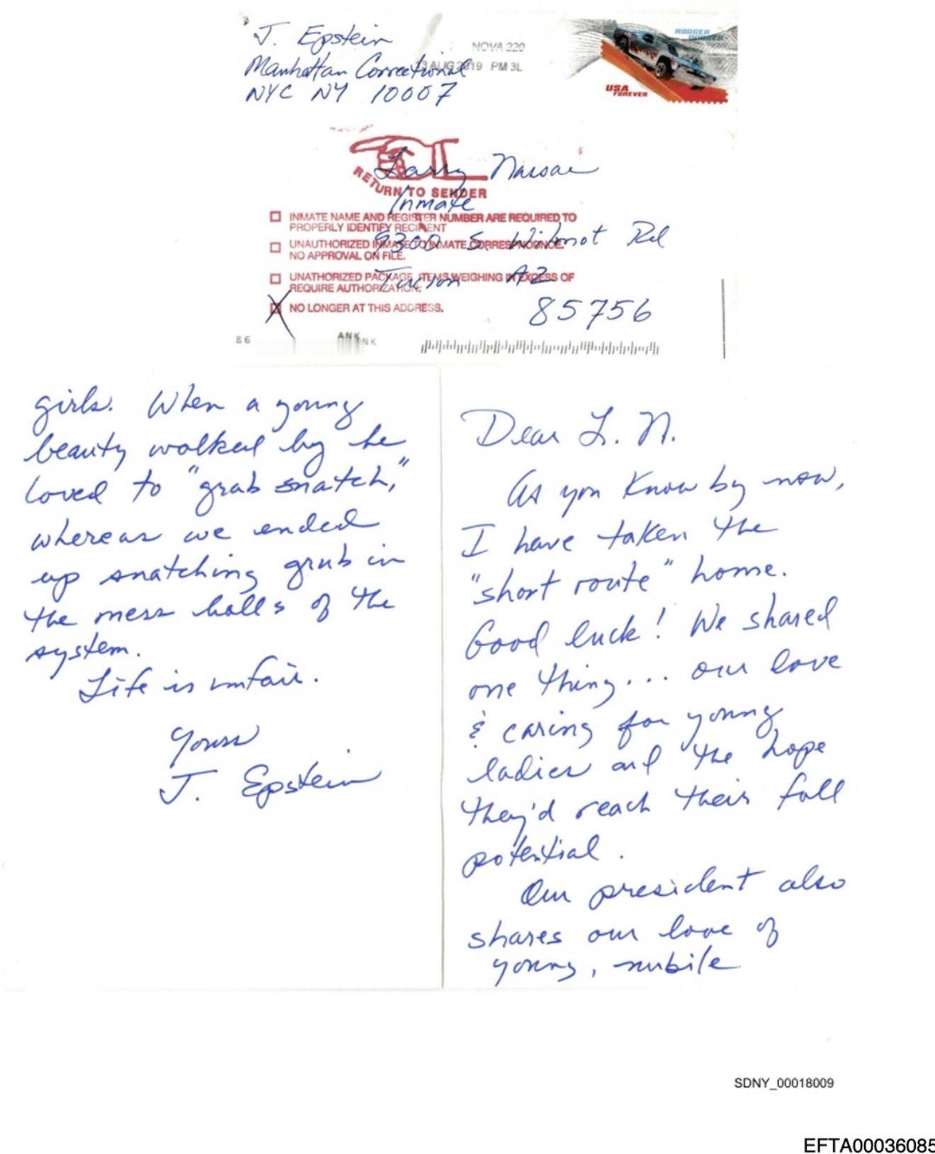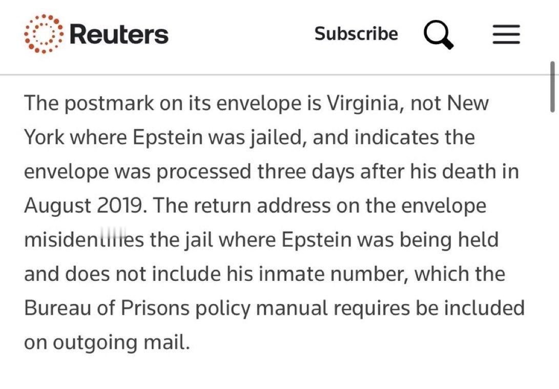 🔻特朗普治下的司法部此前短暂发布了爱泼斯坦档案的第八组数据集,随后又突然将其删除。🔻材料中包含一封据称是杰弗里·爱泼斯坦寄给前美国体操队队医、已定罪的性犯罪者拉里·纳萨尔的信件。信封邮戳日期就在爱泼斯坦去世数天后。信件内容如下:🔻“亲爱的 L.N. 如你所知,我已踏上"捷径"归途。祝君好运!我们曾有一份共鸣……对年轻女子的关爱与期许,希望她们能绽放全部光芒。我们的总统(指特朗普)与我们同样钟情于年轻娇艳的少女。每当佳人路过,他总爱"顺手采撷",而我们只能在体制的食堂里争抢残羹。人生本不公平。谨上,杰弗里·爱泼斯坦。”🔻补充记录显示,该信件曾被提交进行笔迹分析,但尚无明确迹象表明调查人员对其真实性做出过最终结论。信件图像出现在文件编号 EFTA00036086 和 EFTA00036085 中。🔻这封据称由爱泼斯坦寄给纳萨尔的信件此前曾被公开报道,包括《卫报》在2023年6月的相关报道。路透社的报道则指出:“信封上的邮戳是弗吉尼亚州,而不是爱泼斯坦被关押的纽约州,这表明该信封是在他2019年8月去世三天后处理的。信封上的回信地址错误地指明了爱泼斯坦被关押的监狱,并且没有包含他的囚犯编号,而监狱管理局的政策手册要求在寄出的邮件上必须包含该编号。”🔻监管链记录(文件 EFTA00036087)显示,该信件于 2019 年 9 月 25 日被登记。另一份文件(EFTA00036076)证实,联邦调查局曾将该信件送去进行笔迹分析,但结果——若有——仍不得而知。🔻美国司法部表示:“我们正在调查这份据称由杰弗里·爱泼斯坦写给拉里·纳萨尔的信件的真实性,并将尽快公布结果......”🔻截至当前,该材料似乎已重新在司法部网站上以文件 EFTA00035768 的形式可供查阅。🔻美国司法部是故意的吗?爱泼斯坦狱中自杀视频被证实是伪造 热点现场 海外新鲜事