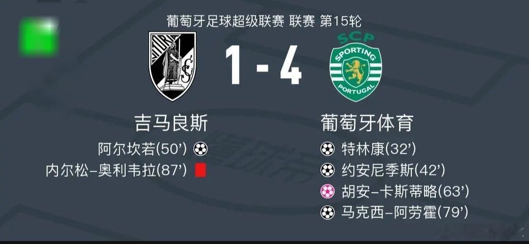 葡萄牙体育4-1大胜吉马良斯,马克西-阿劳霍建功,约安尼季斯破门北京时间12月24日,葡萄牙足球超级联赛第15轮展开较量,吉马良斯坐镇主场迎战葡萄牙体育。比赛中,特林康率先为客队取得进球,随后里卡多-曼加斯送出助攻,约安尼季斯破门扩大比分。易边再战,迪奥戈-索萨助攻阿尔坎若扳回一城。然而胡安-卡斯蒂略不慎将球打入自家球门,令球队再度陷入被动。此后马克西-阿劳霍建功,帮助葡萄牙体育锁定胜局。比赛尾声阶段,内尔松-奥利韦拉被红牌罚下。最终全场比分定格为吉马良斯1-4葡萄牙体育。吉马良斯vs葡萄牙体育足球的魅力足球