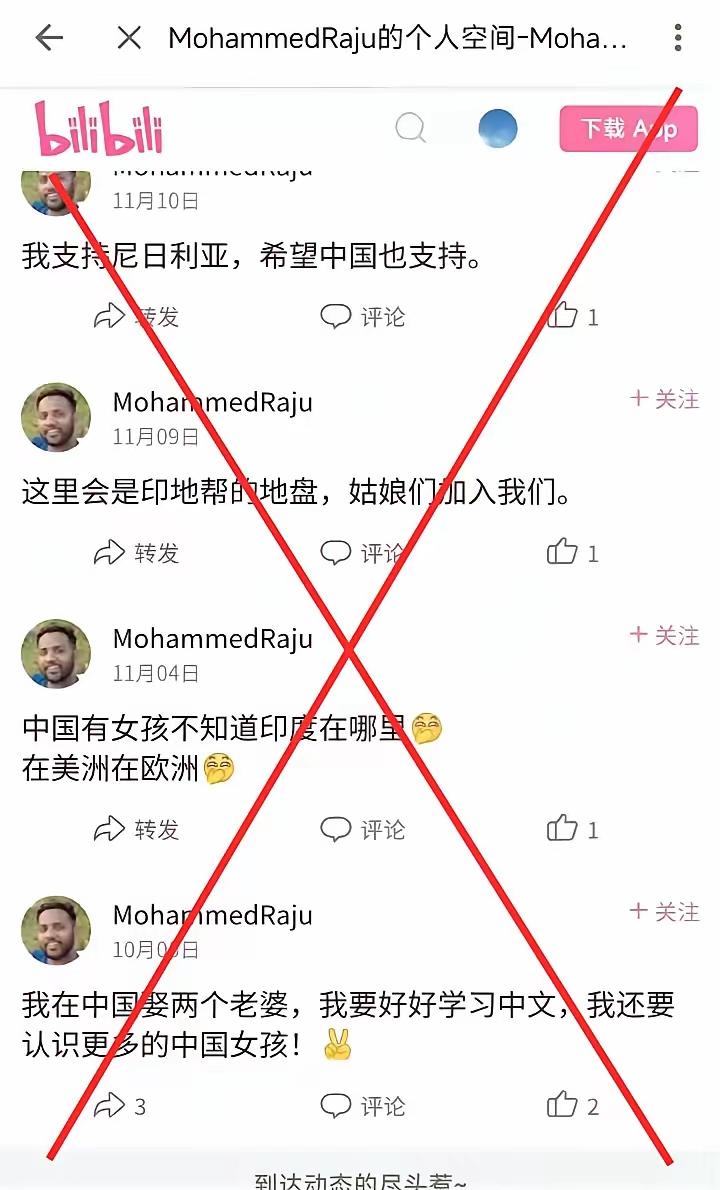 太恶劣了! 这个IP显示在江苏的印度人,在B站上公然发表辱骂中国的不当言论。 他先是侮辱中国女性。 声称自己娶了两个中国老婆,还要认识更多中国女孩,让中国女孩都加入他们所谓的“印地帮”。 这名网友还带有极端精日倾向,公然侮辱民族感情,质疑中国在抗战中打败日本的历史事实,甚至挑衅称“先打败我们印度人再说”。 这些言论一经发布,很快就在B站平台扩散,引发了大量中国网友的强烈愤怒和谴责。 事件的发酵始于几天前,这名印度网友在B站注册了账号,起初只是发布一些日常分享类视频,内容多是自己在江苏的生活片段,并未引起太多关注。 直到他在一条讨论“中外文化差异”的视频评论区留言,开始发表不当言论,才逐渐被网友注意到。 有网友发现其言论不当后,主动反驳了几句,没想到这名印度网友不仅没有收敛,反而变本加厉,在多条评论区和自己的视频下方,集中发布带有侮辱性、挑衅性的内容。 除了侮辱中国女性、挑衅民族情感的言论,他还发表了诸多贬低中国发展、歪曲历史的观点。 比如他声称“中国的发展成果名不副实”,还质疑“抗战胜利的真实性”,这些言论严重触碰了民族底线。 有网友将他的不当言论截图整理后,发布到社交平台,很快就引发了全网关注。 网友们纷纷对其言论进行谴责,认为这种在他国领土上公然侮辱所在国、歪曲历史的行为,极其不尊重人,也违背了公序良俗。 有网友留言表示:“尊重是相互的,你既然选择在江苏生活,就应该遵守当地的公序良俗,尊重中国的历史和人民,发表这样的言论实在令人不齿。” 还有网友指出:“侮辱女性、歪曲历史是底线问题,无论来自哪个国家,都不能容忍这样的行为。” 随着舆论的不断发酵,越来越多的网友向B站平台举报该账号。 网友们要求平台尽快处理该账号,删除不当言论,维护网络环境的清朗。 接到大量举报后,B站平台迅速响应,对该印度网友的账号进行了核查。 经核实,该账号发布的内容确实包含侮辱性、挑衅性言论,违反了平台社区规定和公序良俗。 平台随即对该账号采取了永久封禁措施,同时删除了所有包含不当言论的内容。 B站官方也发布了声明,明确表示将坚决抵制任何侮辱国家、伤害民族情感、违背公序良俗的言论和行为,全力维护健康的网络社区环境。 平台的快速处理得到了大部分网友的认可,大家认为这是对不当言论的有力回应,也彰显了维护网络清朗环境的决心。 不过,也有部分网友在谴责该印度网友的同时,出现了一些针对所有印度人的过激言论,这种情绪蔓延的趋势引发了关注。 对此,不少理性的网友站出来呼吁,要区分个体行为和群体,不能因为一个人的不当言论就否定整个群体。 有网友表示:“这个印度人的行为确实恶劣,但不能因此牵连所有印度人,大多数在华的外国人都是遵守中国法律、尊重中国文化的,我们要理性看待,避免以偏概全。” 事实上,在华生活的外国友人中,绝大多数都能尊重中国的历史文化和公序良俗,不少人还积极参与中外文化交流,为两国友好往来贡献力量。 个别外国人的不当言论,并不能代表其所在国家的整体态度,更不能成为破坏中外友好关系的借口。 信源:李美越直播侮辱中国女性,翻译故意歪曲抹黑,毫无道歉黑料被扒-搜狐娱乐