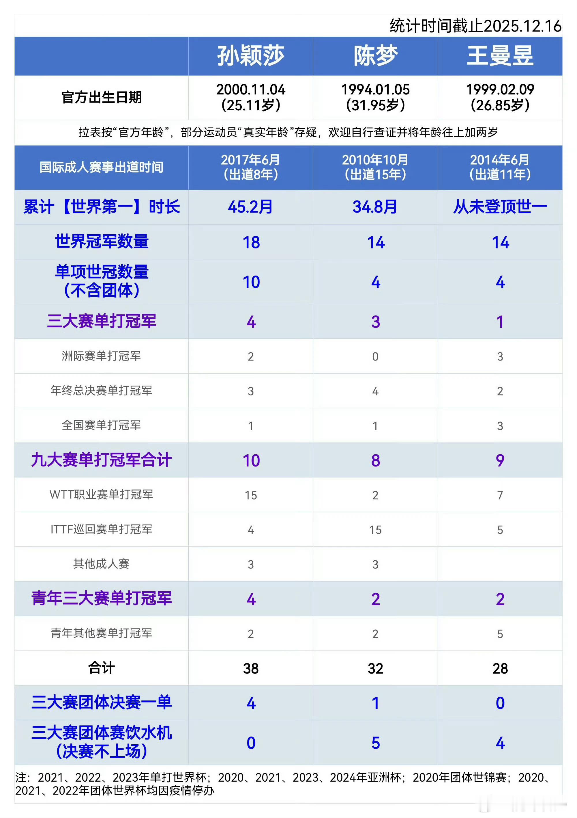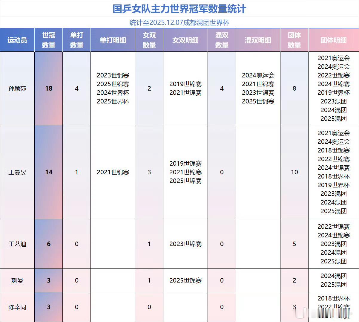 孙颖莎 孙颖莎至今拥有18个世界冠军,2025赛季收获国际赛单打冠军六冠,四个女单卫冕冠军、【世乒赛世界杯双卫冕冠军】☝🏻达成女乒首位世乒赛双圈金满贯☝🏻全部包揽本年度唯二三大赛单打🏆🏆唯一单打外战胜率100%☝🏻连续四年女单年终世界第一☝🏻截止到现在女世一孙颖莎【五个女团世冠】【五次决赛出场】【四次一单】。截止到现在王曼昱【七个女团世冠】 【三次决赛出场】【0次一单】 孙颖莎2025年截止今日获得女单冠军6🏆其中包含三大赛世锦赛世界杯统统都卫冕🏆🏆2025.2.9 新加坡大满贯孙颖莎4-1蒯曼夺冠🏆2025.3.16重庆冠军赛孙颖莎4-0陈幸同卫冕🏆2025.4.20 澳门世界杯孙颖莎4-0蒯曼卫冕🏆2025.5.25多哈世锦赛孙颖莎4-3王曼昱卫冕🏆2025.8.25欧洲大满贯孙颖莎4-2王曼昱夺冠🏆2025.9.14 澳门冠军赛孙颖莎4-3王曼昱卫冕🏆