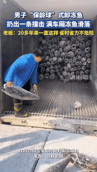 太有头脑了!山东烟台,一装卸工人卸冻鱼时,竟用“保龄球”方式,把一条冻鱼扔到车厢内撞击,满车厢冻鱼就顺势滑出,又快又安全。 这工人可有20多年经验,27吨的车,45分钟就能卸完。要知道,徒手卸冻鱼很危险。 他这招“保龄球”式卸货,巧妙利用物理原理,既省时省力,还保障安全。 网友们也妙语连珠,打趣说像给冻鱼开保龄球联赛。 其实不光卸货,生活里大家总会想出各种奇招解决难题,这就是普通人的智慧,看似简单,却无比实用。 你身边有没有人用这种奇思妙想解决问题的事儿呢?快来评论区唠唠。