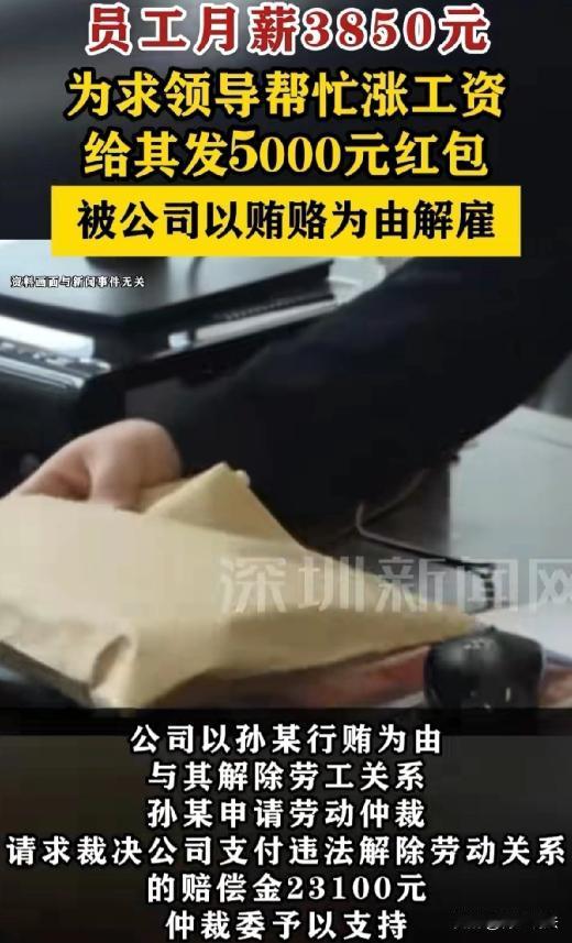 安徽,一小伙月入3850元,生活压力山大,为涨薪,他绞尽脑汁,竟拿出5000元给4个领导发红包,江姓领导2000元,另三个领导各1000元,还在留言里请领导帮忙。本以为能换来涨薪,结果工资没涨,反被公司以行贿为由开除,小伙不服,先后提起仲裁和诉讼,历经三次审理,最终落得个人财两空,不禁感叹:为什么涨薪就这么难! (本信息来源于:深圳新闻网、上观新闻) 孙某,每月工资3850元。 这点钱,交完房租水电,再买点生活用品,基本就空了。 每个月看着钱包瘪瘪的,他心里愁得慌。 孙某有个朋友,之前和他一起进的公司,现在人家都升职加薪了,日子过得有滋有味。 孙某看着自己,每天勤勤恳恳工作,工资却纹丝不动,心里那叫一个着急。 他无数次在心里问自己,为什么别人都能涨薪,自己就不行呢? 为了能涨薪,孙某绞尽脑汁。 他想来想去,觉得给领导“表表心意”或许是个办法。 公司里有四个领导,说话挺有分量。 孙某拿出自己好不容易攒下的5000元,他给江姓领导转了2000元,另外三个领导各转了1000元。 转完钱,孙某还在留言里诚恳地请领导帮忙,希望能给自己涨点工资。 转完红包后,孙某满心期待,每天都在想,领导看到红包会不会给自己涨薪呢? 说不定过几天,工资条上的数字就变大了。 他越想越开心,工作起来都更有劲了。 然而,现实却给了孙某沉重的一击。 没过几天,孙某没等来涨薪的消息,却收到了公司发来的解除劳动关系通知书。 公司说孙某行贿,违反了公司规定,所以要开除他。 孙某一下子就懵了,他怎么也没想到会是这样的结果。 孙某心里那个委屈,自己只是想涨点工资,怎么就成了行贿呢? 他觉得公司这么做太不合理了,于是决定申请仲裁。 在仲裁的时候,孙某把自己心里的苦水都倒了出来,说自己生活压力太大,才想出这个办法,希望能得到仲裁委的理解和支持。 仲裁委经过审理,觉得孙某虽然方法不对,但也是生活所迫,而且公司直接开除他有点过分,于是支持孙某获赔23100元。 孙某拿到这个结果,心里稍微好受了点,觉得自己的权益总算得到了一点保障。 可公司不服这个仲裁结果,直接上诉了。 一审的时候,因为公司用的是旧版《员工手册》,里面没有把“行贿”明确列为违规行为,所以法院认定公司违法解除合同。 孙某听到这个消息,心里别提多高兴了,觉得自己的胜算又大了几分。 但事情并没有那么简单,二审的时候,公司拿出了新版《员工手册》,而且证明孙某签收过。 新版手册里明确规定了行贿属于违规行为,公司可以解除合同。 这样一来,法院就认定孙某的行为违规,公司解除合同是合法的,不需要赔偿。 孙某的心情一下子从云端跌到了谷底,他怎么也没想到,会因为一本新版手册,让自己之前的努力都白费了。 孙某还是不甘心,又向高院申请了再审。 可高院经过审理,驳回了他的再审申请。 这下,孙某彻底绝望了,不仅没涨成薪,还丢了工作,赔进去的钱也打了水漂,真是人财两空。 孙某为了涨薪给领导发红包,这种做法在生活中常见吗? 很多人可能觉得生活压力大,想走捷径涨薪,这种想法能理解,但行贿肯定是不对的,不仅违反公司规定,还可能触犯法律。 公司用新版《员工手册》来认定孙某违规,这种做法合理吗? 从公司管理角度看,更新规章制度是为了更好地规范员工行为,但也得考虑员工是否知情,不能随意用新版规定来处理之前的行为。 孙某的经历给我们打工人什么启示? 打工人想涨薪,还是得靠提升自己的能力,靠踏实工作,走歪门邪道终究不是长久之计,还可能让自己陷入困境。 孙某想涨薪出发点没错,可方法错了。 他没想着通过提升自己能力来涨薪,却选择行贿这种错误方式,最后落得个人财两空。 在工作中要遵守规定,靠正当途径去争取自己的权益。 您对这件事有什么看法呢?