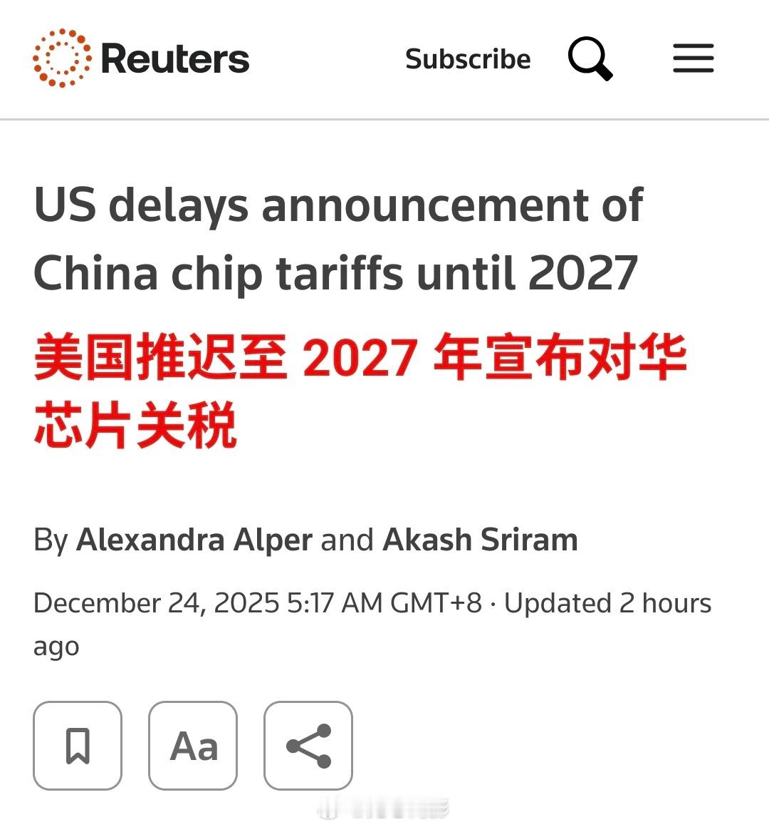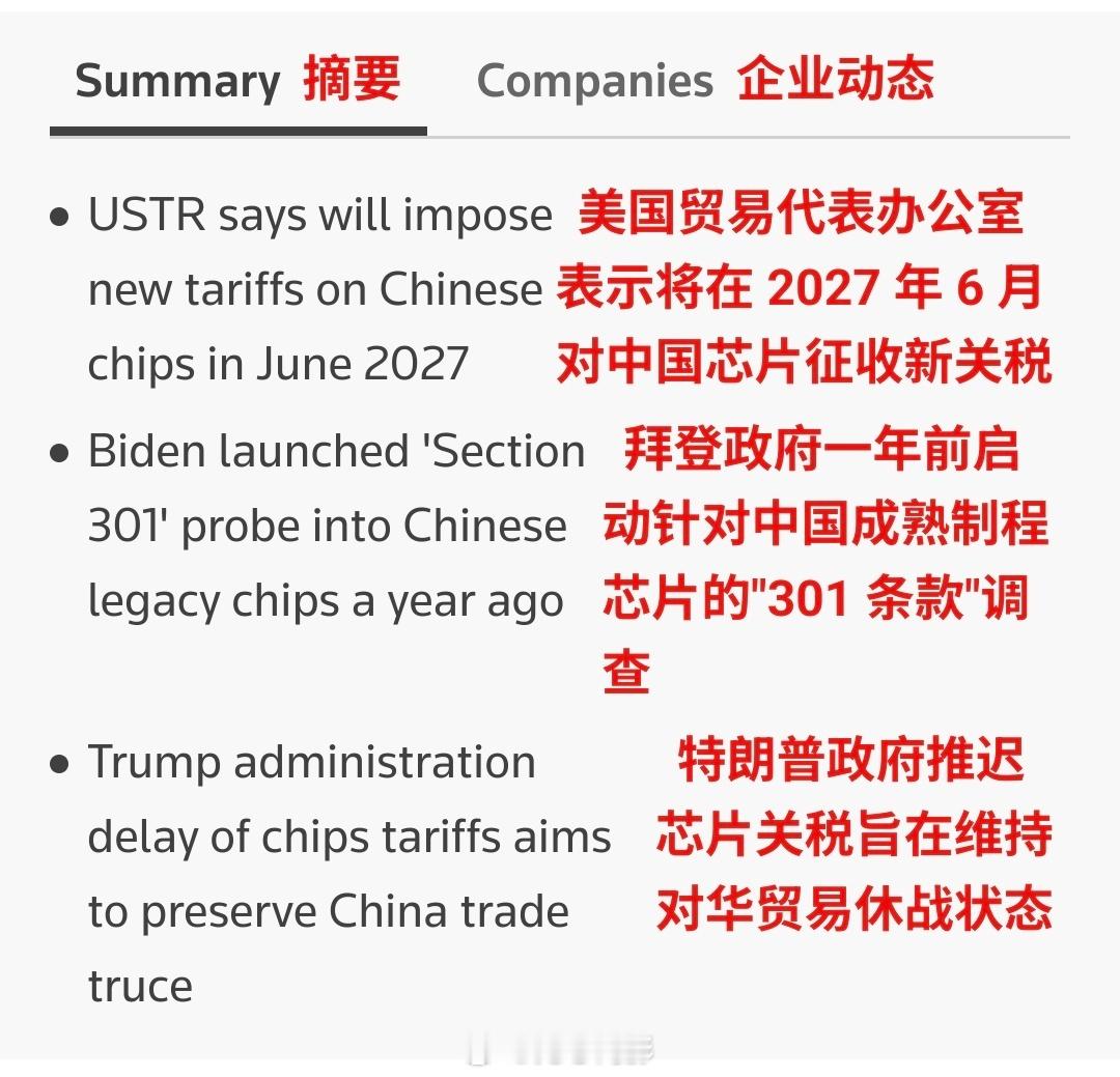 美国将中国芯片关税,推迟至2027年。美国特朗普当局于周二表示,鉴于中国“不合理”地谋求芯片产业主导地位,美方将对自华进口的半导体产品加征关税,但相关举措将推迟至2027年6月实施。一份文件显示,关税税率将至少提前30天公布。此前,美国前总统乔·拜登政府曾针对中国向美出口的“传统”(即技术相对老旧的)芯片发起为期一年的“301条款”不公平贸易行为调查。美国贸易代表办公室在一份声明中表示:“中国将半导体产业列为谋求主导地位的目标,此举不合理,且对美国商业造成负担或限制,因此美方有权采取应对措施。”中国驻美国大使馆对美方拟加征关税的行为表示反对。使馆在发给路透社的声明中指出:“将经贸和科技问题政治化、工具化、武器化,破坏全球产业链供应链稳定,最终只会损人害己。”使馆还强调:“我们将采取一切必要措施,坚决维护自身合法权益。”当前,中国对全球科技企业依赖的稀土金属实施出口管制,且这类资源由中国掌控。美方此次推迟加征关税,既保留了特朗普政府后续实施征税的权力,也意在缓和与中方的紧张关系。(路透社)海外新鲜事