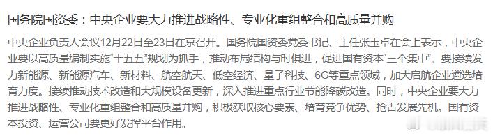 国务院国资委:中央企业要大力推进战略性、专业化重组整合和高质量并购要接续发力新能源、新能源汽车、新材料、航空航天、低空经济、量子科技、6G等重点领域,加大启航企业遴选培育力度。