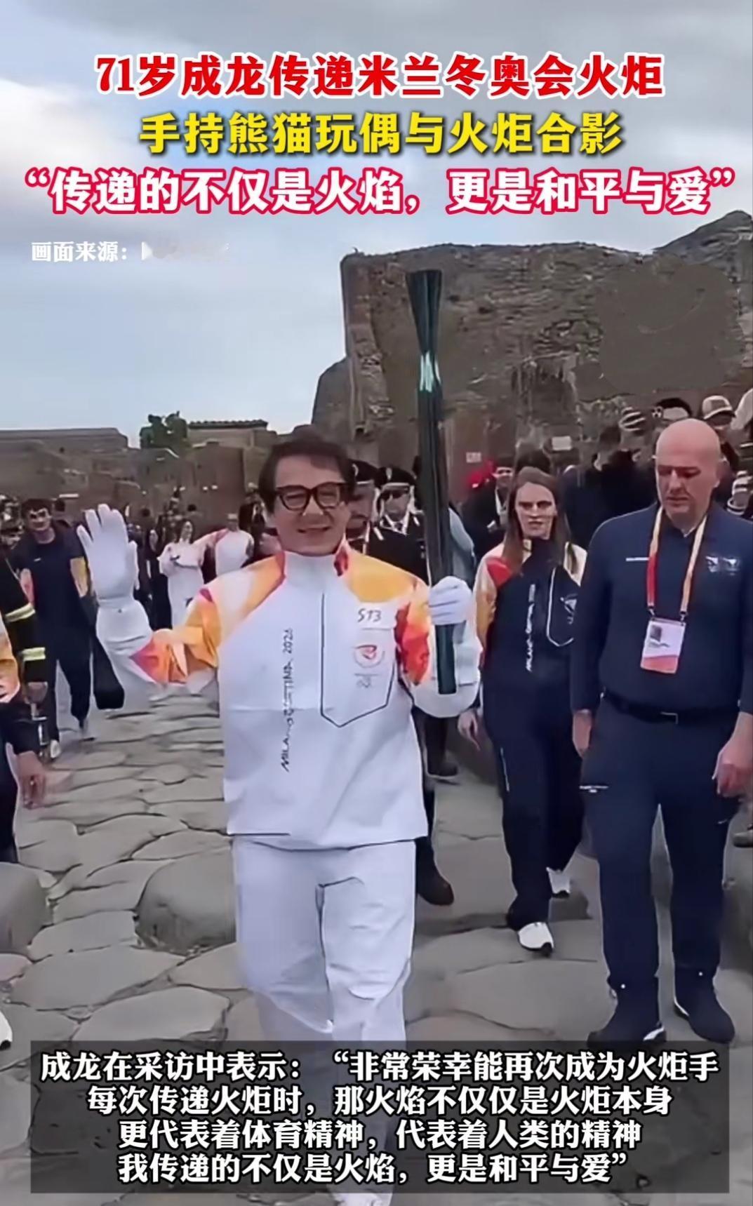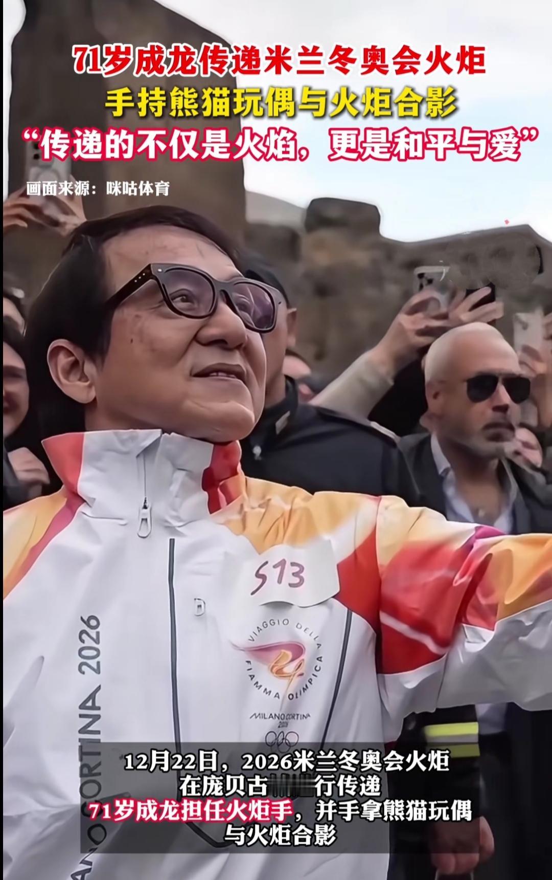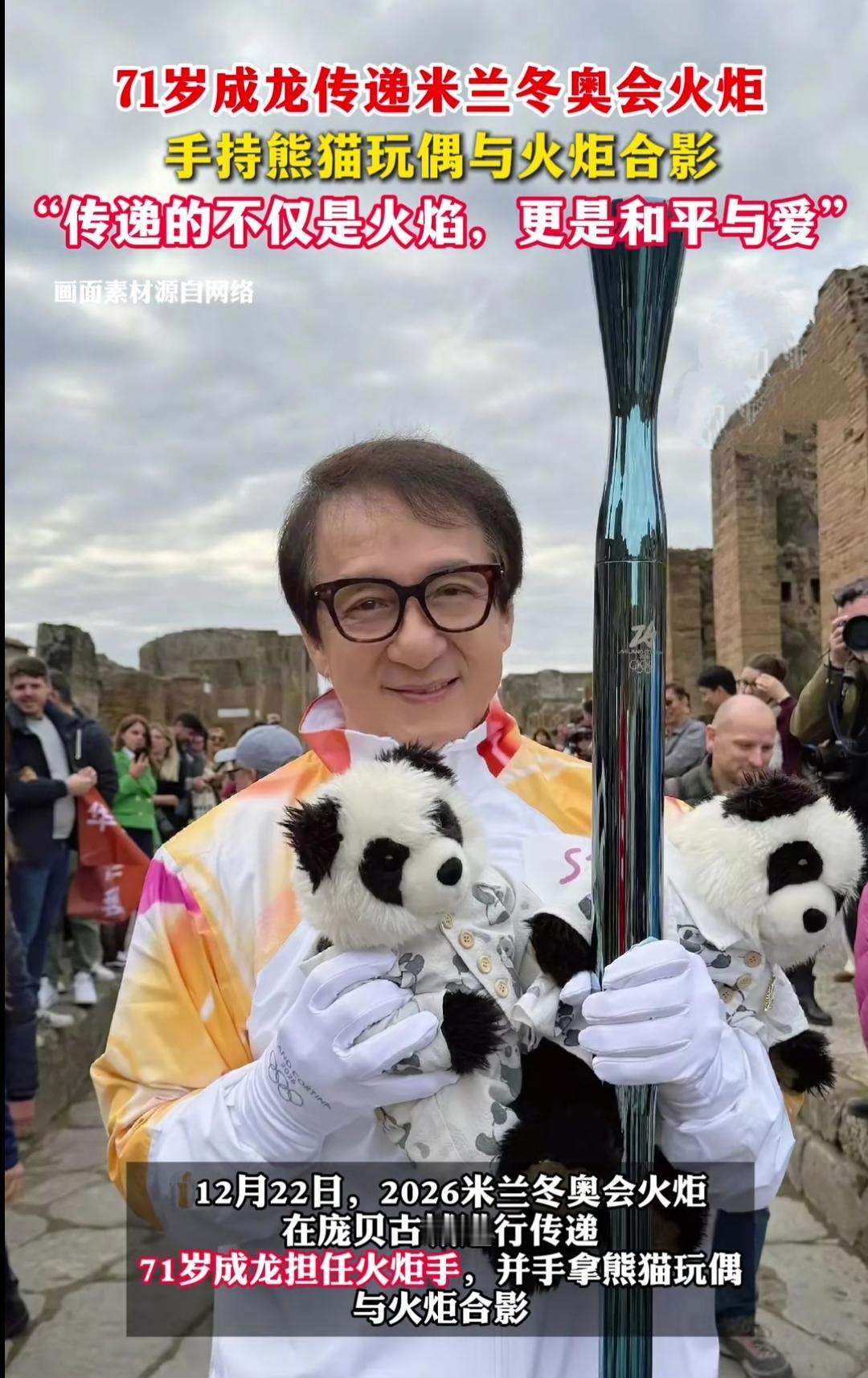 谁能想到,71岁的年纪还能在古罗马废墟上“追风”?当地时间12月22日,成龙身着红色火炬手制服,在庞贝古城接过米兰冬奥会火炬的瞬间,全网瞬间破防——不是因为惊天特技,而是他掌心紧攥的熊猫玩偶,和眼里藏不住的滚烫光芒。 作为多次参与国际重大活动的华人代表,这次他没有喊出豪言壮语,只说“火炬传递的不是火焰,是爱与和平”。1.2万公里的火炬之路,途经意大利300多个市镇,而他的身影,成了最鲜活的中国名片。 有人说他一把年纪还“拼”,可在我看来,这哪里是拼,是老一辈艺人刻在骨子里的家国情怀。从荧幕上的功夫英雄,到现实中的文化使者,他用一生告诉我们:真正的偶像,从不是昙花一现的流量,而是历经岁月沉淀,依然愿意为热爱、为家国挺身而出的坚守。向成龙致敬,也向这份永不褪色的赤子之心致敬!