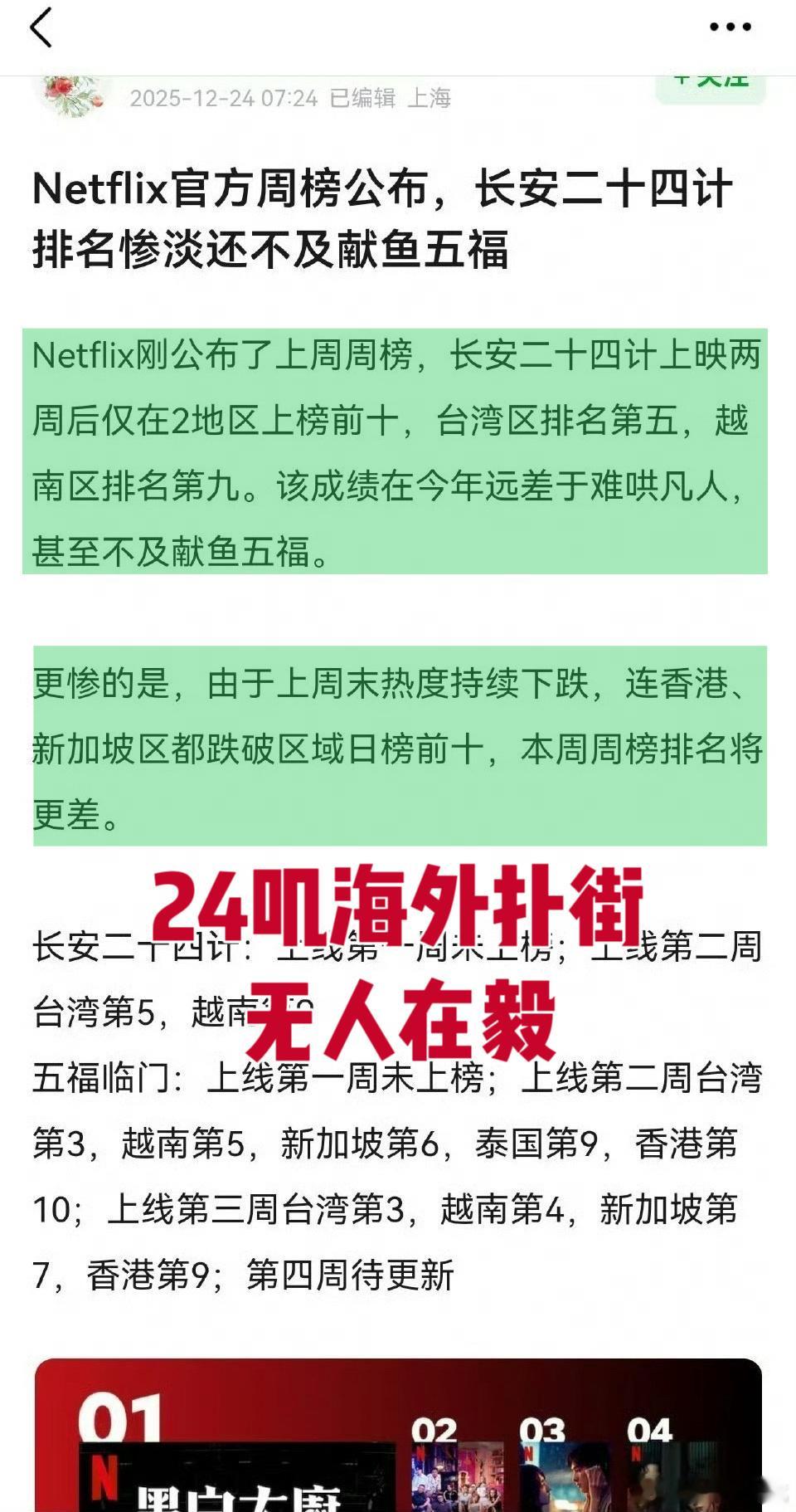Netflix官方周榜公布 长安二十四计排名惨淡还不及献鱼五福,并且持续下跌中……