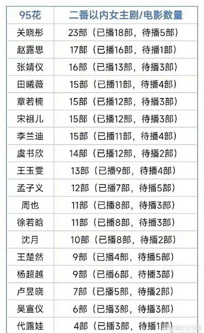 95花二番以内女主剧/电影数量~这么看卢昱晓是不是在95里算回报率比较高的