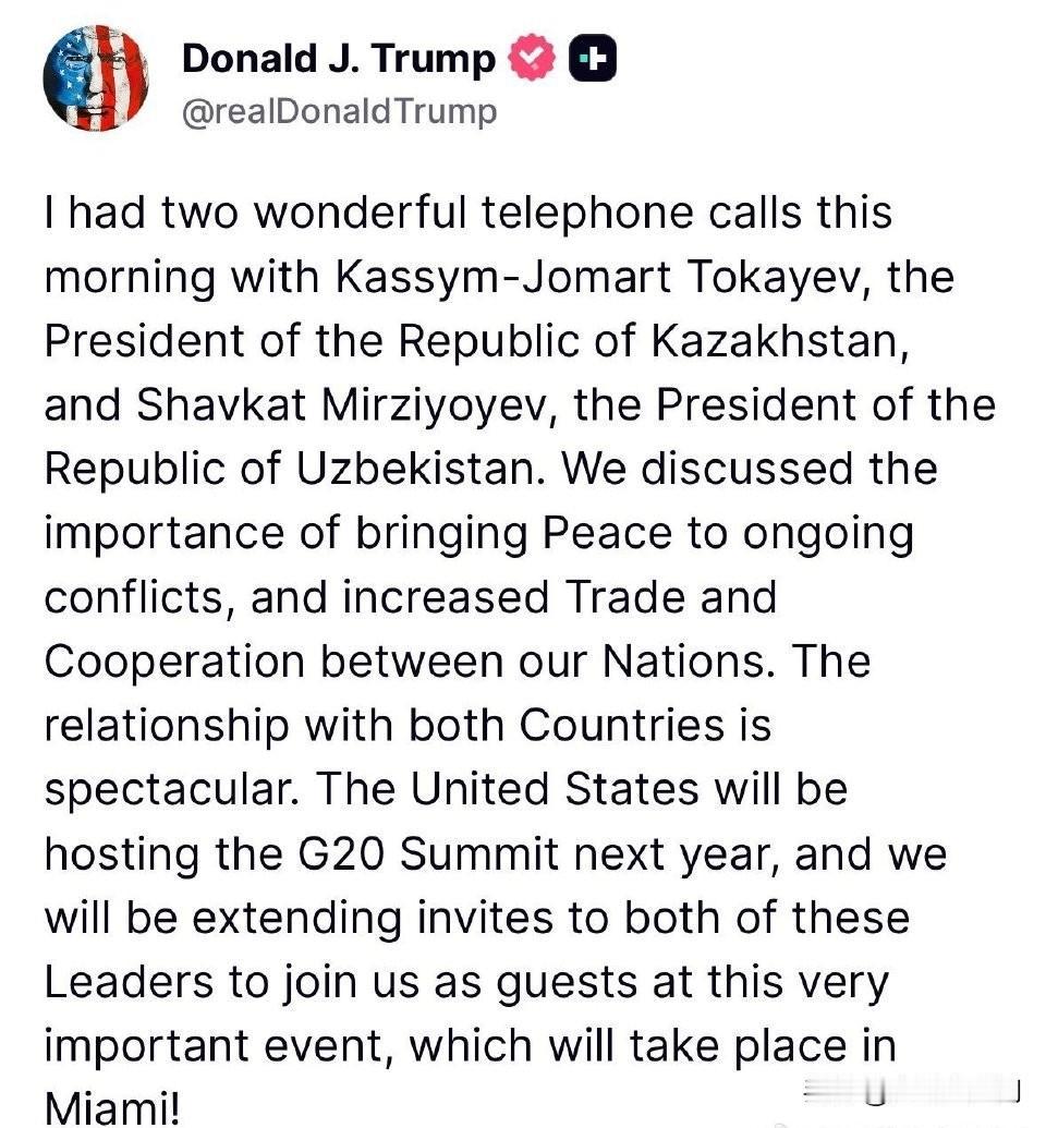 【黄金时代】川普邀请哈萨克斯坦和乌兹别克斯坦参加明年在佛罗里达州迈阿密举行的二十国集团峰会 “今天上午,我与哈萨克斯坦共和国总统卡西姆-若马尔特·托卡耶夫和乌兹别克斯坦共和国总统沙夫卡特·米尔济约耶夫进行了两次愉快的通话。我们讨论了为持续冲突带来和平的重要性,以及加强两国之间的贸易与合作。我们与这两个国家的关系非常密切。美国将于明年主办二十国集团峰会,我们将邀请这两位领导人作为嘉宾出席在迈阿密举行的这一重要盛会!