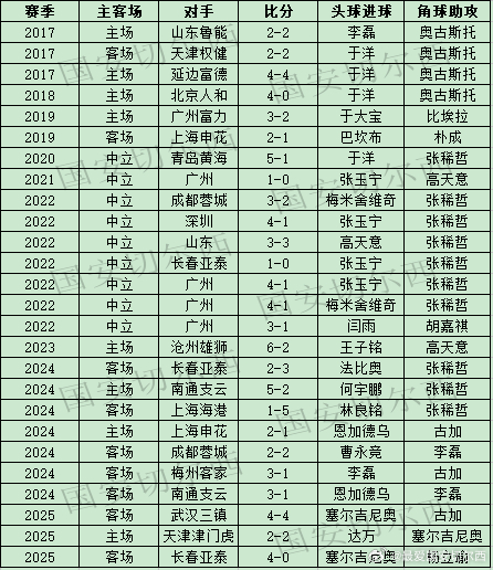 【赛季数据总结-头球破门(球员、球队篇)】 2025赛季球队在联赛共有18次头球破门得分,超越2022赛季的14次,成为2016赛季后完成头球破门最多的赛季。2016赛季后球队在联赛已经完成88次头球破门。在球员方面,本赛季联赛完成最多的是法比奥,共有8次,创造单赛季联赛完成头球破门的最高记录。同时法比奥在球队联赛共完成14次头球破门,超越巴坎布和张玉宁,成为2016赛季后完成头球破门最多的球员。林良铭本赛季联赛完成5次。塞尔吉尼奥完成2次。王子铭、恩加德乌和达万各完成一次。现在阵中球员完成头球破门的还有张玉宁9次、林良铭7次、王子铭4次、恩加德乌4次,张稀哲、李磊和塞尔吉尼奥各2次、达万、曹永竞、何宇鹏、柏杨和方昊各1次。 本赛季球队在联赛有5次是利用角球头球直接破门,少于上赛季的7次。2016赛季后,球队23次利用角球头球直接破门。在球队历史中,角球头球破门并不是太多,每个赛季最多也就有两三次。其中2022赛季和2024赛季是最多的,达到7次。17和19赛季分别有3次和2次,其他赛季也就1次,2016赛季1次都没有。在进球方面,于洋和张玉宁各有4球。本赛季恩加德乌有两次。在角球助攻方面,张稀哲有10次,奥古斯托有4次。本赛季塞尔吉尼奥有2次,达万有1次。 本赛季球队还有2次通过任意球传中直接头球破门,在2016赛季后,和2022赛季并列最多。两次头球破门的都是林良铭,主罚任意球的分别是张稀哲和古加。在本赛季之前2016赛季后,球队在联赛利用任意球头球直接破门的只有4次,22赛季完成2次。
