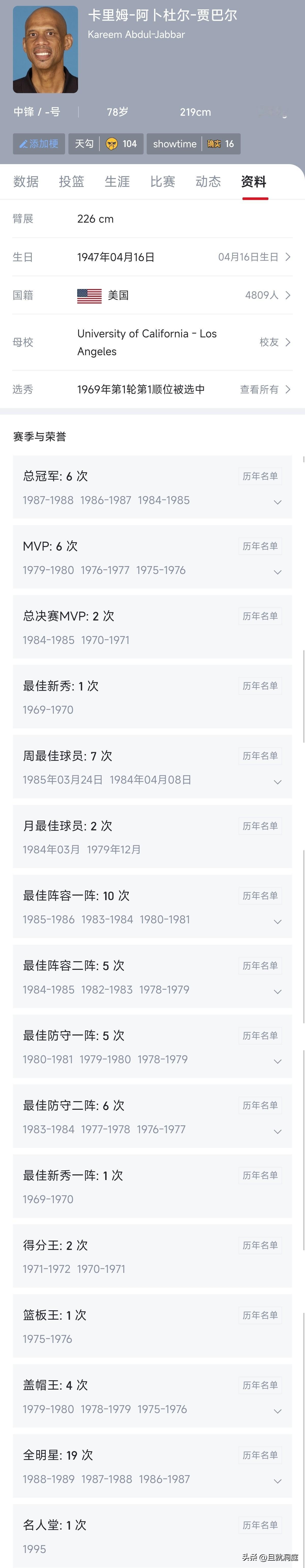 曾经的他也是荣誉满身,总得分第一(如今第二),总篮板第三(如今第三),总盖帽第一(如今第三),拿到6个总冠军,6个MVP,2个FMVP,两个得分王,一个篮板王,四个盖帽王。 为什么他从来不说自己是历史第一,而是要让给乔丹。而有的人得分还没拿到第一,才四个总冠军和四个MVP,就说自己是历史第一。真的没有想通,难道四比六大些吗?