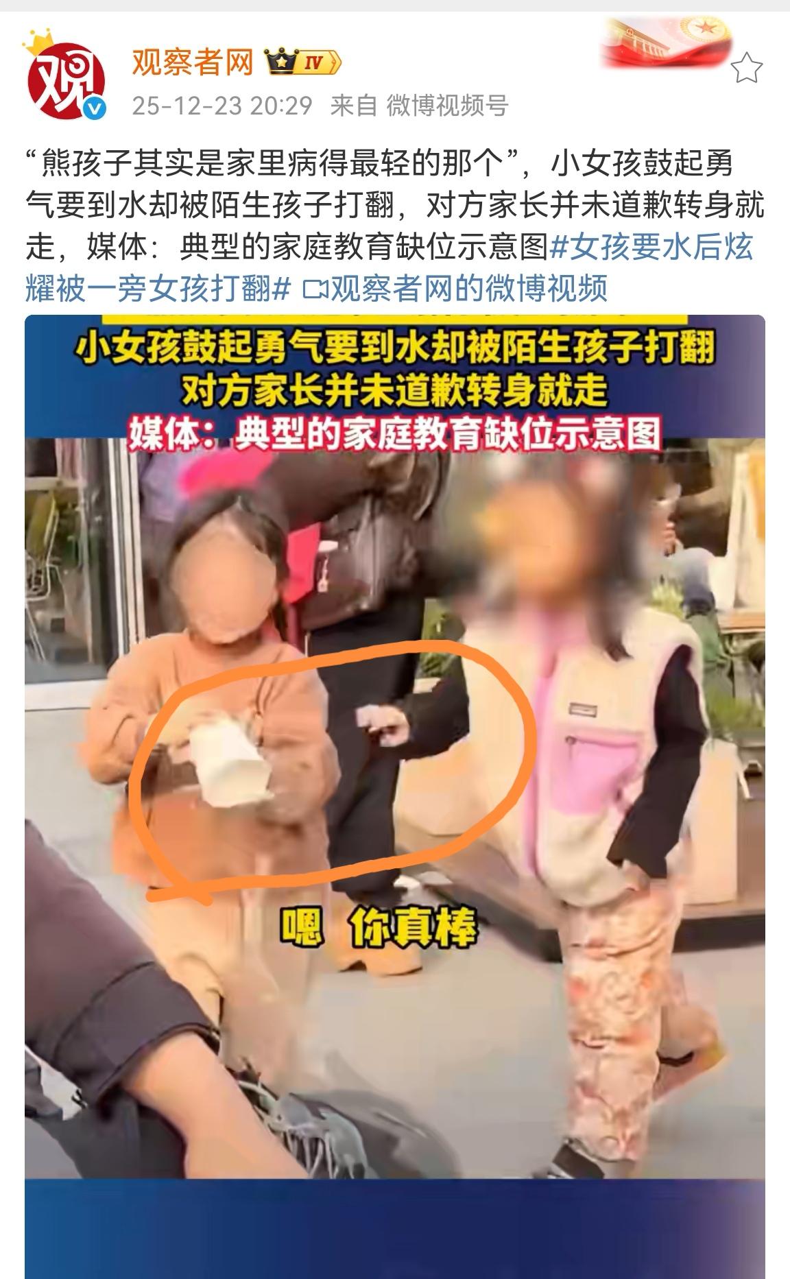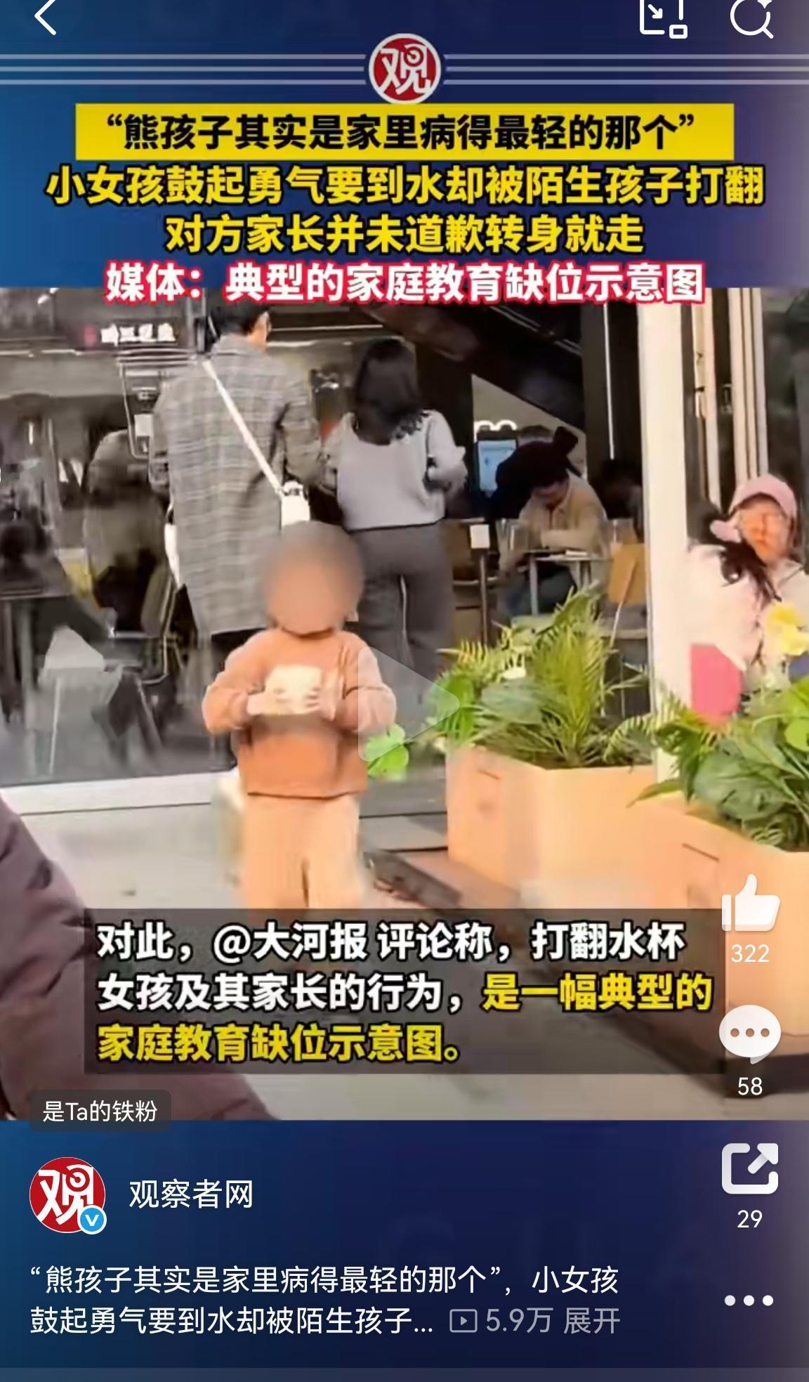 这是目前我们看到对于此事件所有媒体中最好的观点:熊孩子其实是这个家庭病得最轻的那个。 本来是一个温馨的画面:小女孩鼓起勇气要到一杯水,一边走向妈妈一边向妈妈分享自己成功的喜悦,妈妈也及给予了情绪上的反馈并夸赞“你真棒。” 但此时突然从旁边插入一个稍大点的孩子伸手就把小女孩手中的杯子打翻了。更令大家不解的是,对方家长就在旁边,居然未做道歉与补救措施转身就走了。 作为对比可以看出两个家庭明显不同教育观和责任感,因为做题的是家长,孩子就是答卷。 以合适的方式帮助孩子理解边界感、责任感其实非常重要。因为终什么因就会得什么样的果。 孩子与父母之间密切关联的时候很长很长,想象十年二十年后,家里是欢声笑语还是鸡飞狗跳,都和教育的选择有很大关系。 公共场所熊孩子