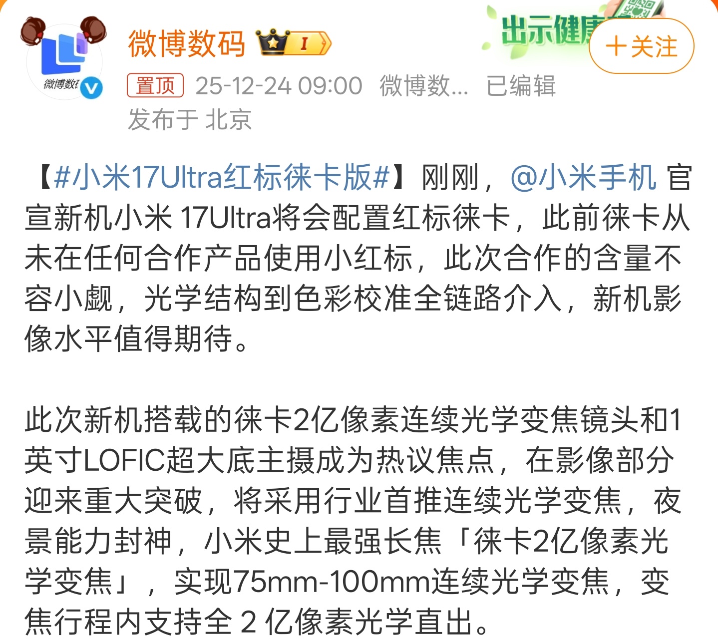 小米17Ultra红标徕卡版这应该算是小米17Ultra的保时捷设计版,看看跟标准版相比有没有什么新功能。据说这个机型售价过万,本博觉得不大可能,比普通版贵了1000块就差不多了,估计8999。老张聊数码
