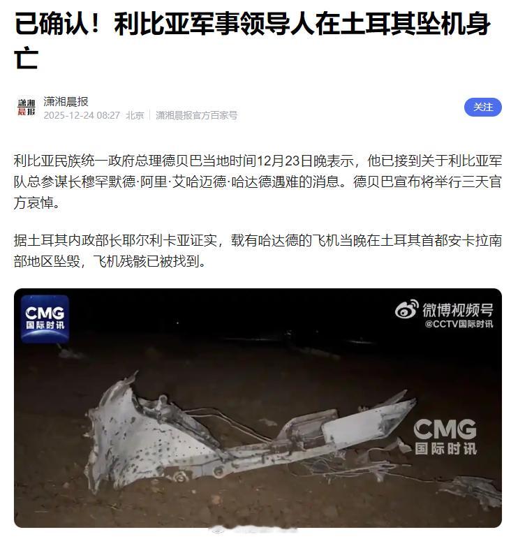 利比亚军事领导人在土耳其遇难烽火问鼎计划热点现场 利比亚突发地缘地震?这时间,多多少少两边同时发了力,虽然是巧合,但这样的巧合凑一起,搞不好又是一场石油战争。12月23日,利比亚西方派的黎波里方面,出动了一个高级军官代表团去土耳其。结果,回来的时候坠机了,飞机上7个人全噶。这次搭乘的是法国达索“猎鹰-50”型公务机,北非迷信法兰西,又遭了一次罪。特别是,这飞机上,一个上将,2个少将。利比亚西方派损失惨重。领头的是利比亚总参谋长哈达德,上将军衔,官职是利比亚军队总参谋长。然后带着的两个少将,一个是格里比埃勒,利比亚陆军司令。另一个是卡塔维,是军事制造局 (军工复合体) 局长。当这三个人出现的时候,第三个人的身份就很关键了,这揭露了这次利比亚抵达土耳其的直接目的——采购军备。土耳其现在作为利比亚西方派的幕后大老板,利比亚西方派想进货了,第一个想到的就是土耳其。因为,巴基斯坦,正式向利比亚东边的哈夫塔尔集团,出售了42亿美元的装备。这还不把利比亚西方派吓得赶紧去土耳其求购。结果倒好,订单估摸是拿到了,但是核心军事高层,人没了。这一波,西方派即将面临的是新一轮军事内部的人员调整。而如果哈夫塔尔在这个时候突然出手,利比亚又将是怎样的混乱?
