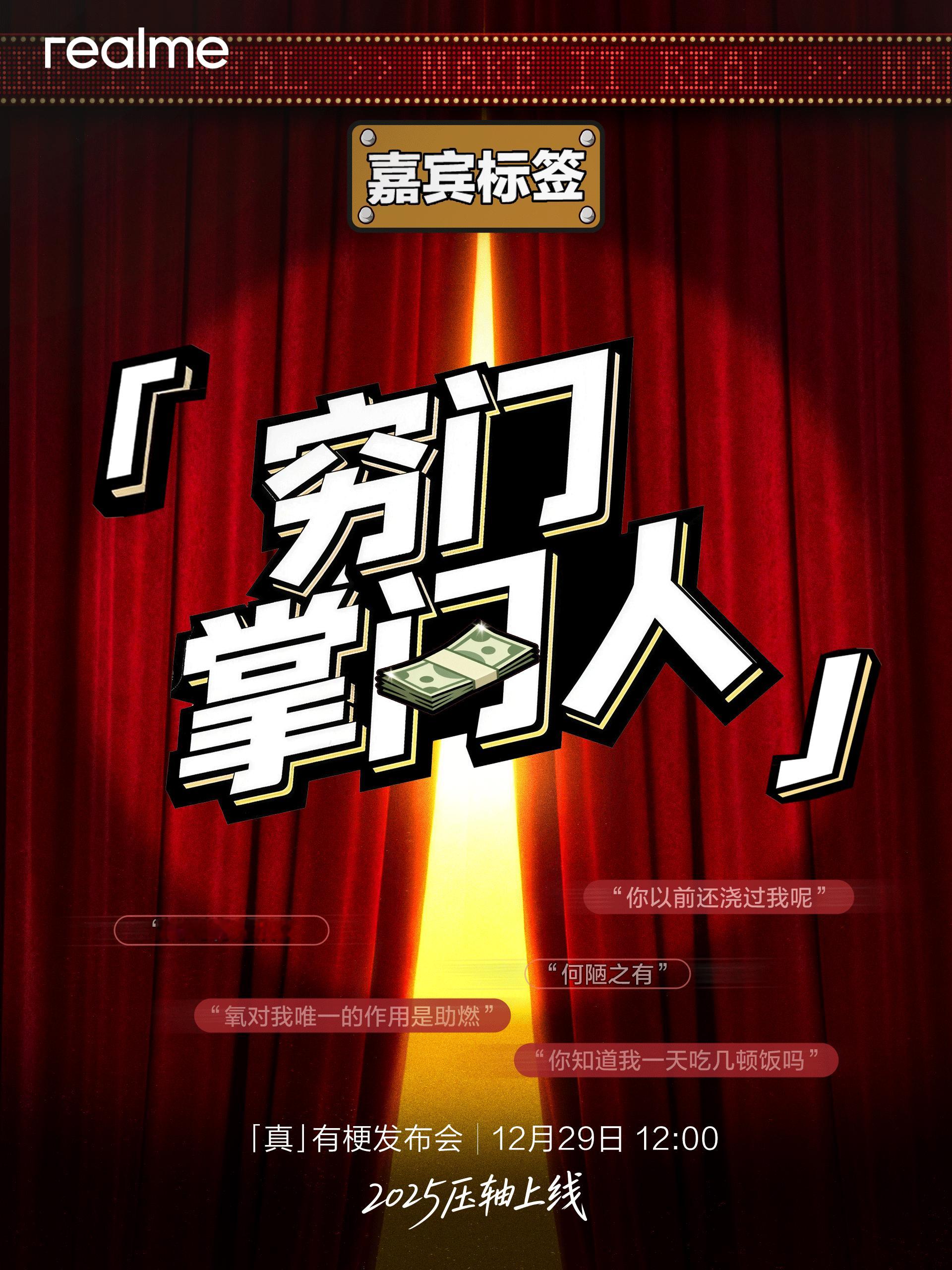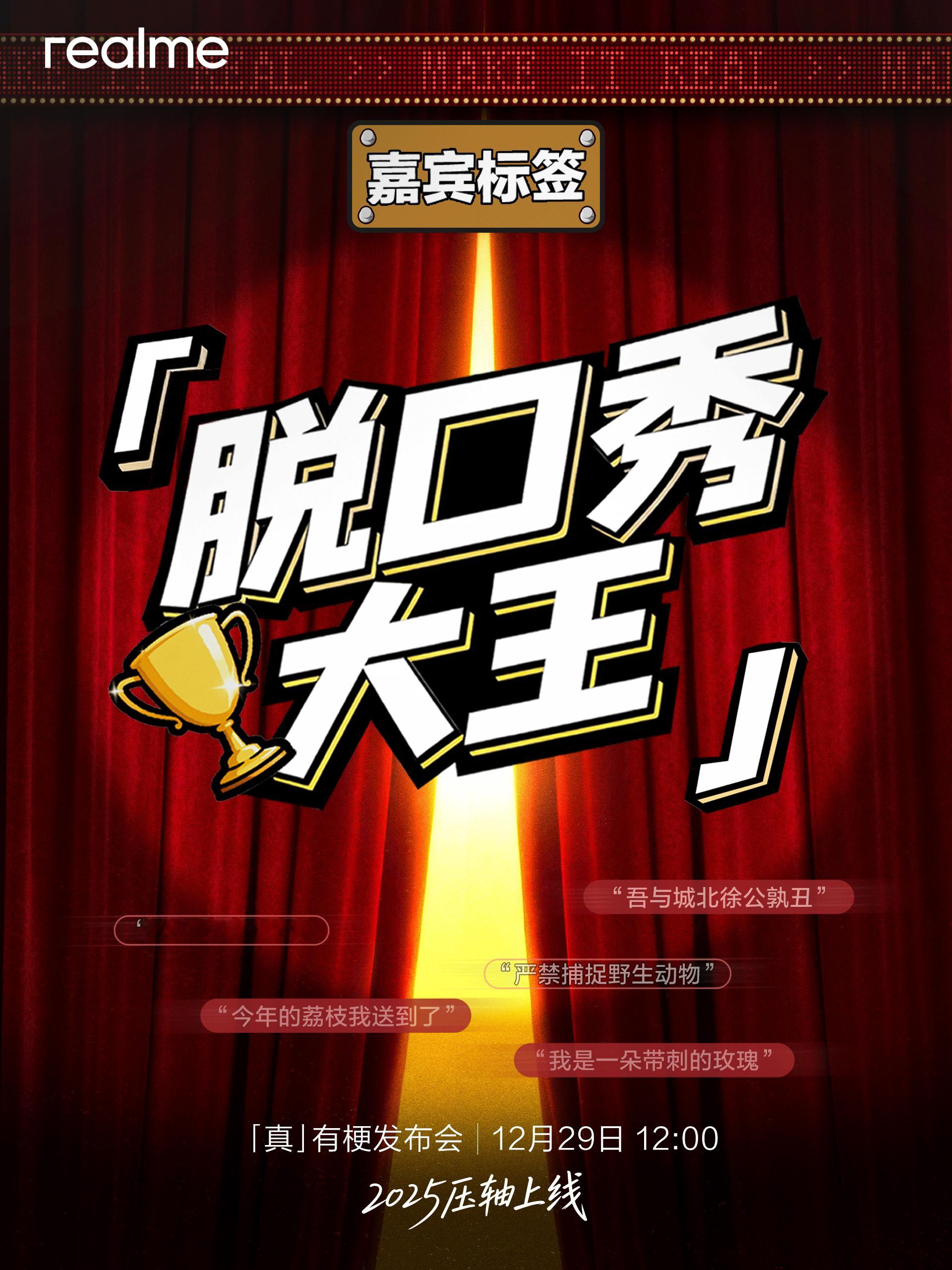 这次不是手机发布会,真我realme 宣布:邀你一起打破传统,不聊手机聊热梗!真有梗发布会将于12月29日上线。