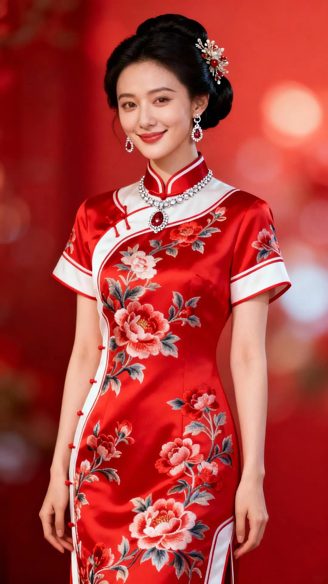红白相间的旗袍,搭配精致的盘发和花饰,尽显东方古典美!