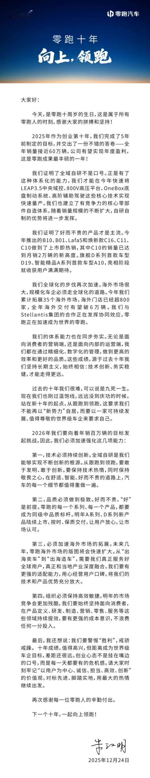 零跑十周年,朱江明发布内部信:别再把自己当新势力了,要开始按世界级车企来要求自己。 他把过去十年形容成“九死一生”,而现在也只是刚过温饱线。现在销量上来了,账开始赚钱了,但远没到可以松口气的时候。 2025 年零跑全年销量大概率会接近 60 万辆,海外差不多6万辆,新势力里已经站到前排;三季度已经连续盈利,今年有可能第一次把全年账算正。 信里反复提到的并不是庆祝,而是提醒。 零跑还是要走那条老路:全域自研、成本定价、好而不贵,把省下来的成本直接让给用户。但越是这个阶段,朱江明越强调一句话:要警惕“胜利”,不能让规模掩盖了品质和效率的问题。 12 月 28 日零跑会在杭州办十周年发布会,D 系列也会继续对外披露。 虽然成绩斐然,但这封信的意义并不是在单纯开庆功会,更像是在这个节点给自己重新校准方向。 对零跑来说,真正的考验已经不是“能不能活下来”,而是能不能在下一阶段,把规模、利润和长期主义同时守住。 大v聊车 零跑汽车