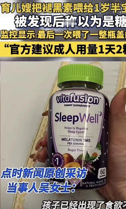 丧尽天良!海南海口,一女子发现,自己的褪黑素不见了,她询问月嫂,月嫂说她以为是糖,一整瓶都给孩子吃了,女子急了,那可是助眠药物,她查监控,发现月嫂先给孩子喂了一粒,为了方便出门干活,月嫂又倒出一整瓶盖,放在沙发上让孩子自己吃下,之后月嫂出门,孩子出现食欲不振,腹泻,嗜睡,走路不稳,女子报警,网友: 不是不懂,纯属是坏! 吴女士产后一直饱受失眠困扰,之后在医生建议下购买了褪黑素。 她记得很清楚,瓶子上明确标注“每日不超过2粒”,而且她自己也严格遵守这个规定,只有在辗转难眠的夜晚才会服用半粒。 史某是吴女士通过正规中介聘请的“金牌月嫂”。 在面试时,史某拿出各种证书:母婴护理证、营养师证、甚至还有“十佳育婴师”奖状。 而且她说话条理清晰,演示婴儿护理动作十分专业。 让吴女士像是抓住了救命稻草,当场就签了合同,而且月薪比市场价高出20%。 最初几个月,史某确实表现得无可挑剔。 她会在孩子睡觉时主动打扫卫生,还会给吴女士讲解育儿知识。 而吴女士甚至庆幸自己遇到了贵人,经常在朋友圈夸赞史某的敬业精神。 然而就在12月2日下午的监控画面,成为吴女士永远的噩梦。 视频显示,史某先喂给孩子一粒白色药片。 随后,她做出了令人匪夷所思的举动:直接拧开褪黑素瓶盖,将数十粒药片倒在沙发垫上,然后拍了拍孩子的小手,示意他自己拿着吃。 在完成这一切后,史某整理了一下衣服,拎起包出门了。 而监控时间戳显示,她这一走就是三个小时。 那么在此期间,1岁半的幼儿在沙发上爬来爬去,不时抓起药片塞进嘴里。 “她甚至没有给孩子倒水!”吴女士后来向警方陈述时,声音仍在颤抖。 要知道那瓶褪黑素共有60粒,成人每日最大剂量仅为2粒。 而史某一次就让孩子服用了超过成人半月用量的剂量。 在随后的日子里,孩子出现了明显的中毒症状:食欲不振、腹泻、嗜睡、走路不稳。 当时吴女士多次向史某询问孩子情况异常的原因,而史某总是以“天气变化”“生长发育正常现象”等理由搪塞。 直到12月12日,吴女士因失眠想找褪黑素服用时,才发现药瓶不见了。 于是她打电话给正在休假的史某,对方起初支支吾吾,最后才承认“以为是糖喂给孩子了”。 预感大事不好的吴女士立即调取全部监控,才发现史某这种喂药行为不是一两次了。 在过去的两个月里,每当史某想要外出办私事时,就会给孩子服用褪黑素。 这样孩子会沉睡数小时,而她就可以自由活动。 咱都知道褪黑素是一种胺类激素,对婴幼儿可能造成严重危害。 专家指出,婴幼儿肝脏代谢功能尚未发育完全,过量服用褪黑素可能对肝脏造成负担,甚至抑制性腺发育。 而且更令人担忧的是,褪黑素补充剂市场存在剂量标注不准确的问题。 有一项研究发现,部分褪黑素软糖的实际含量甚至达到标注剂量的3.5倍。 那么这对婴幼儿来说更加危险。 美国毒物控制中心报告显示,褪黑素已成为儿童误服的首位药物,2021年就有5.2万例儿童摄入褪黑素的个案报告。 其中两名幼儿因过量服用而死亡。 于是当即吴女士就带着孩子赶往医院,并且报警。 吴女士报警后,警方已介入调查。 根据《刑法》第二百六十条之一,虐待被监护、看护人罪可处三年以下有期徒刑或拘役。 如果孩子的损伤程度经鉴定达到轻伤标准,史某可能涉嫌故意伤害罪。 那么即使未达轻伤标准,其长期故意损害婴幼儿健康的行为,也可能被认定为“情节恶劣”的虐待被监护、看护人罪。 而且更令人深思的是,家政行业存在监管漏洞。 你看在此事件中的育儿嫂虽然持有各种证书,但其专业素养和职业道德却令人质疑。 而且行业内部资料互通机制不完善,使得有问题的服务人员可以轻易更换中介继续工作。 那些个证书就跟假证一样,毫无用处,这要是保姆自己的孩子她还能做出这样的事儿吗? 吴女士的孩子目前肝肾功能检测正常,但医生表示,褪黑素对神经系统发育的长期影响仍需观察。 而史某已被警方采取强制措施,等待法律的审判。 这个故事折射出当代育儿困境中的一个侧面:信任建立需要经年累月,崩塌却只需一瞬间。 当照顾孩子的人为图省事而滥用药物,不仅突破了职业底线,更触碰了人性最基本的红线。 我们将最珍贵的孩子托付给他人时,再多的谨慎都不为过。 而育儿嫂行业也需要更严格的监管和培训,让“金牌”二字不再只是纸上谈兵。 每个孩子都是父母手心的宝贝,任何为了省事而损害孩子健康的行为,都不该被轻易原谅。 此事件正在进一步调查中,我们期待法律给出公正的裁决。 主要信源:(育儿嫂将褪黑素当糖多次喂给宝宝 宝妈:未经允许擅自投喂,已报警!——红星新闻)