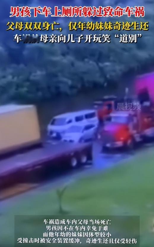 “这就是命啊!”12月22日,哥伦比亚一家4口出去玩,中途儿子内急下车如厕,母亲拍视频时还开玩笑说:"拜拜,胡里奥",结果,背后一辆疑似刹车失灵的半挂卡车,直接撞向他们的轿车,父母当场死亡,男孩不在车内幸免于难,他年幼的妹妹因体型较小,被安全装置缓冲,奇迹生还! 视频里,母亲的声音透着轻松,她举着手机,对着刚推开车门下车的儿子胡里奥打趣道别。 如果不是后续的悲剧,这不过是普通家庭旅行途中的温馨小插曲,那句“拜拜”也只是再寻常不过的玩笑话。 可谁也没想到,短短几秒钟后,音频里突然闯入刺耳的轰鸣声——重型轮胎抱死摩擦地面的尖啸过后,是天崩地裂般的金属撞击声,死神甚至没给车内的父母留下反应的时间。 这不是电影脚本,而是发生在哥伦比亚布加-布埃纳文图拉公路上的真实梦魇。 救援人员在扭曲成废铁的车辆残骸中找到这部手机时,屏幕里记录的笑声和现场的惨烈形成了刺眼的对比。 罪魁祸首是一辆从后方呼啸而来的满载半挂集装箱卡车,疑似刹车失灵让它成了失控的钢铁怪兽,毫无减速地从后方“吞噬”了这辆刚停稳的家用轿车。 这场事故最让人唏嘘的,就是生与死的界限竟如此模糊又精准。常说“差之毫厘,谬以千里”,在这里,生死的距离甚至不用毫厘衡量。 胡里奥只是因为内急忍不住要下车解决,这个再寻常不过、甚至有点尴尬的生理需求,竟让他恰好避开了死神的镰刀。 当集装箱卡车的巨大冲击力把轿车挤压成铁饼时,站在路边草丛里的他,成了全家唯一毫发无损的旁观者。 更离奇的是,车厢里本应绝无生还可能的年幼妹妹,也奇迹般活了下来。不是靠运气,而是因为她太小了。 剧烈撞击让车身结构严重溃缩,这种足以挤碎成年人骨骼的力量,却在扭曲的角度下,为体型娇小的婴孩留出了一丝缓冲空间。 再加上安全座椅的包裹,她像风暴眼中的羽毛,在崩塌的世界里只受了轻伤。 可这从来不是什么幸运的故事,而是给所有成年人的沉重警告。我们必须回头看这起惨剧背后的致命决定——路边停车。 很多人潜意识里觉得,只要不靠在马路中间,靠边停一下没什么大不了。但从现场的惨烈程度能推测,当时的轿车大概率停在了视觉盲区,或是陷入了最危险的“三明治”陷阱:前方有车,后方又有高速驶来的重卡。 老司机圈里一直有个保命习惯:迫不得已停车或堵车时,只要前方有大车,一定要把方向盘往路外侧打死。 这样一来,万一后方遭遇无法抵挡的撞击,车身会顺着力道滑出道路,而不是被钉在原地当缓冲垫。 可惜,胡里奥的父母当时正处于出游的放松状态,注意力全在和下车的儿子互动上,完全没留意到身后逼近的死亡阴影。 对于幸存的胡里奥来说,身体没受伤,心里的伤口却可能一辈子都好不了。上一秒,妈妈还笑着喊他名字说“拜拜”,下一秒,那句玩笑就成了永别的遗言。 他在路边回头的瞬间,看到的不再是温馨的家庭车,而是一堆扭曲的金属废墟,和再也无法回应他的父母。 这种从天堂瞬间坠落地狱的落差,哪怕是成年人都可能精神崩溃,更别说一个尚未成年的孩子。 现在,两兄妹暂时被安置在亲戚家,公益组织也介入了心理干预。但有些东西碎了就再也拼不回来了。 妹妹虽然保住了命,可关于父母的记忆一片空白,只能靠哥哥的描述和那段最后的视频拼凑父母的模样。 而胡里奥,往后每次想起那个下午,“内急”这个曾让他羞于启齿的生理反应,都会变成一块沉重的石头压在心上——它救了他的命,却也让他亲眼目睹了双亲的惨死。 事故调查还在进行中,目前矛头指向卡车失效的刹车系统。可再多的赔偿、再清晰的责任认定,也换不回一个完整的家庭。 道路上的意外从不管你是不是好人,也不管你车里有没有孩子,当巨大的动能失控时,生命在钢铁面前没有任何特权。 这场惨剧再次提醒每一个握方向盘的人:高速公路的路肩从来不是安全岛,而是潜在的死亡通道。除非车子真的动不了,否则永远别在高速车流旁停车。 如果必须停,一定要把目光从手机和家人的笑脸上移开,死死盯着后视镜——你永远不知道,下一辆呼啸而来的大车能不能刹住,会不会让一句随口的“拜拜”,变成一辈子的遗憾。