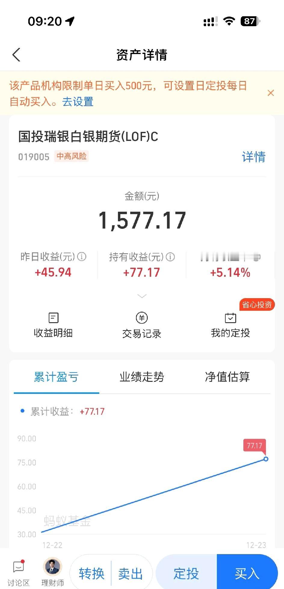 白银彻底疯了啊! 白银期货今天又是6个点,基金差不多有三个多点,我就买两天就有5%的收益了,选择大于努力啊!