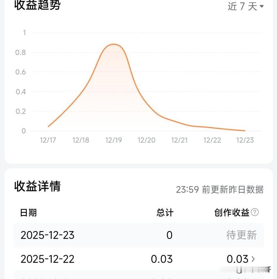 这两天白忙了,收益几分钱?我还有再坚持下去的动力吗? 好长时间没写头条,看着别人写头条忙得不亦乐乎,我也想下决心好好的深耕一下头条,管他写得好不好?先写了再说。 好不容易抓耳挠腮的写了几篇,看当天阅读量是2000多,我估计第二天应该有个块八毛的收入,这收入可是比我在头条领金币要强得多。 我领金币最多的收益,也只有两三毛钱,写头条只要把心里话写出来,如同写日记一样,就可以收益几毛钱,我觉得写头条比领金币更有意义。 可我没想到的是,千字阅读量只有一毛多钱,以前单价收益从来没这么低。 我以为最近头条改版了,要淘汰像我这种只会记流水账的作者,头条的这种做法我很认可,只怪我能力有限,而且又不努力,我顿时感觉既惭愧又失望。 谁叫咱只会记流水账,而不会写有深度的文章呢,看来做什么事情都需要努力呀。 今天我还是有点不死心,想继续写头条,管他有钱没钱,只当写日记吧。 再次写头条时,发现我的首发声明没打开,是不是因为上次首发声明没打开,收入才变低了呢?明天看看再说。