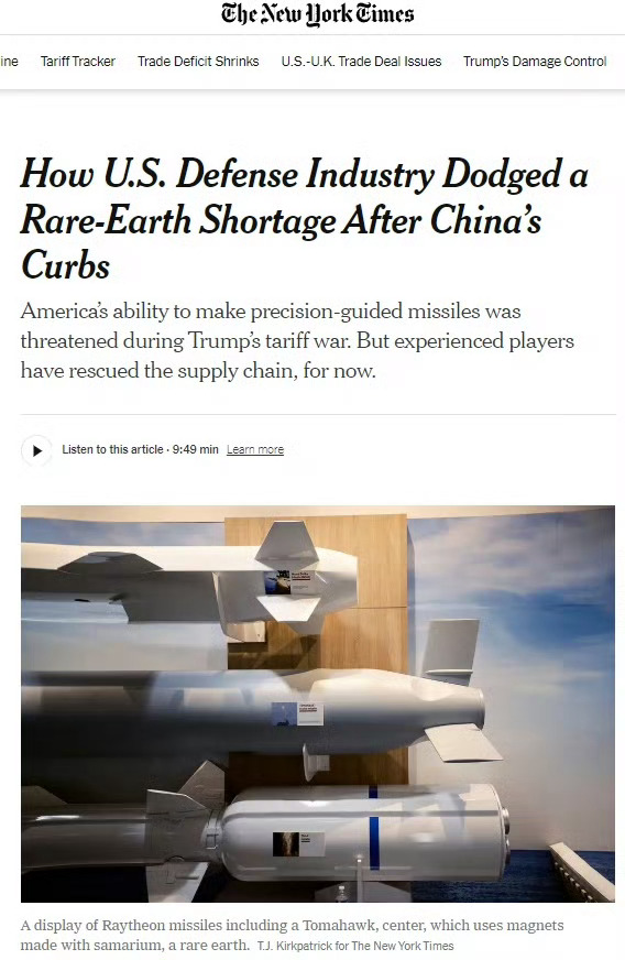 中国“断供”,美国国防工业如何避免稀土短缺。雷神公司制造的导弹,“战斧”导弹(中)使用的磁体由稀土元素钐制成。由于能精准命中千里之外的目标,“战斧”巡航导弹成为了各国军方所觊觎的利器。这种精确制导的实现依赖于弹翼上使用了由钐制成的强力磁体--钐是一种能够耐受高温的稀土金属。今年中国对部分稀土实施出口管制后,切断了向美国国防承包商供应钐的渠道,而这些承包商为“战斧”导弹的制造商雷神公司供货。钐几乎完全在中国进行加工,全球超过85%的稀土磁体产自中国。一项经过精心安排、涉及两家欧洲公司的交易为美国国防承包商提供了新的钐来源,使生产暂时得以继续。但这一供应来自一批自上世纪70年代起就存放在法国一家工厂里的原料,数量十分有限。现在,在欧洲库存耗尽之前,特朗普政府正争分夺秒地开拓新的供应来源。今年4月,在特朗普总统对中国等多国加征关税后,中国开始要求钐以及另外六种稀土金属的出口必须获得许可证。中国驻华盛顿大使馆的一名发言人在电子邮件中表示,这些出口管制措施是为了“维护世界和平”。将钐用于军事目的的外国企业已被允许采购该材料。“所有国防承包商都无法沿用过去的采购渠道获取钐金属,”雷神公司一家供应商的高管坦言。由于话题敏感,此人要求匿名。“我们已被列入黑名单,再也拿不到这种材料了。”大多数稀土磁体由钕制成,广泛用于手机、汽车零部件和电子产品等日常领域。但国防工业需要的是钐钴磁体,它们能够承受极端高温。一块钐样品,它具有很高的耐热性。寻找替代方案极为重要。除非能够找到新的钐来源或替代材料,否则美国制造商将无法生产战斗机或精确制导导弹。曾负责供应链事务的前国防部官员艾莎·海恩斯表示,如果无法获取合适的磁体,他们可能被迫在武器精度上作出牺牲。正在研发的新型装备系统--例如高超音速导弹--同样取决于能否从中国之外的地方获得钐金属。“绝不能让任何一个国家拥有如此大的主动权,”已于4月退休的海恩斯说。“对方随时可以切断供应阀门。”若非磁体制造业内人士的远见,局势或将更为严峻。总部位于纽约罗彻斯特,在瑞士、泰国和中国设有工厂的Arnold Magnetic Technologies首席商务官亚伦·威廉姆斯透露,当中国于4月4日宣布出口管制时,该公司手头已备有超过一年的钐金属库存。到了夏天,Arnold公司的客户开始担心库存耗尽后怎么办。于是,Arnold公司向英格兰利物浦附近的Less Common Metals公司董事长格兰特·史密斯求助--该企业是西方世界所剩不多的稀土金属制造商之一。史密斯多年来一直在寻找中国钐的替代来源。最终他在法国的一家工厂找到了:一批封存数十年的硝酸钐库存。这批原料的所有者是比利时化工企业索尔维,其法国工厂曾位居全球最大稀土氧化物生产商之列。将矿石转化为磁体需使用大型溶剂槽分离17种桥土元素,这一工艺正是索尔维公司参与开创的。据该公司发言人透露,20年前索尔维已停止在法国的稀土分离业务,称其变得“无利可图”。威廉姆斯指出,在中国以外加工的钐成本要高出五到八倍。但索尔维保留了半成品库存,并且仍掌握着将其进一步精炼成史密斯所需形式的技术与设备。而Less Common Metals恰巧拥有一台能处理此工序的旧熔炉。法国拉罗谢尔的一家索尔维公司旗下的稀土工厂。史密斯迅速组建了客户联盟,除Arnold还包括Permag--后者旗下的Electron EnergyCorporation是数十年来为美国国防工业供应钐钴磁体的另一家制造商。这种买家俱乐部模式使史密斯能向索尔维报出具有吸引力的价格,以精炼全部约200吨库存。史密斯将索尔维的钐运至英国,在那里将其转化为可熔炼合金的金属锭。随后,他的客户会把这些材料压制成块,美国的工厂再将其切割成磁体。这些磁体最终将植入导弹的弹翼舵机系统一一通过调节弹体尾翼方位来控制飞行轨迹。史密斯的交易刚刚谈妥,中国宣就布了出口限制。自那以后,他的电话几乎就没停过,焦急的航空航天和国防企业四处寻找钐的来源。“他们打来电话时,我可以拍着胸口告诉他们:不用恐慌,我们已经替你们安排好了:“史密斯说。他的公司此前经营状况一直不佳。”从4月4日开始,我只休了两天假。我不是在开玩笑,真是忙疯了。”史密斯估计,索尔维的这批库存足够其美国国防工业客户使用一年多。Arnold公司的威廉姆斯表示:“稀土的问题在于,加工过程必须足够经济--你需要足够大的规模。格兰特搭建了一座短期到中期的过渡桥梁,这一点至关重要。”钐金属的市场需求相对有限。据行业咨询机构“关键矿物研究所"联合主席杰克·利夫顿估计,美国国防工业年需求量不足200吨。史密斯对在索尔维库存耗尽前启动其他供应源充满信心,但下一批钐将来自哪里,仍远未明朗。在宾夕法尼亚州兰迪斯维尔,Electron Energy Corporation工厂的一名技术人员正在混合钐钴合金。特朗普政府已向加利福尼亚稀土矿的所有者MP材料公司提供了1.5亿美元贷款,用于扩建其钐金属加工设施,这是与该企业数十亿美元合作计划的一部分。但该项目可能需要数年才能实现产能。比外,政府还向印第安纳州的ReElement Technologies提供了8000万美元贷款,该公司正运用新技术加工钐。第三家企业--加拿大的Ucore Rare Metals--已获得美国军方2240万美元资助,将在路易斯安那州建