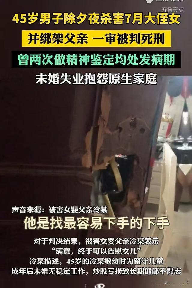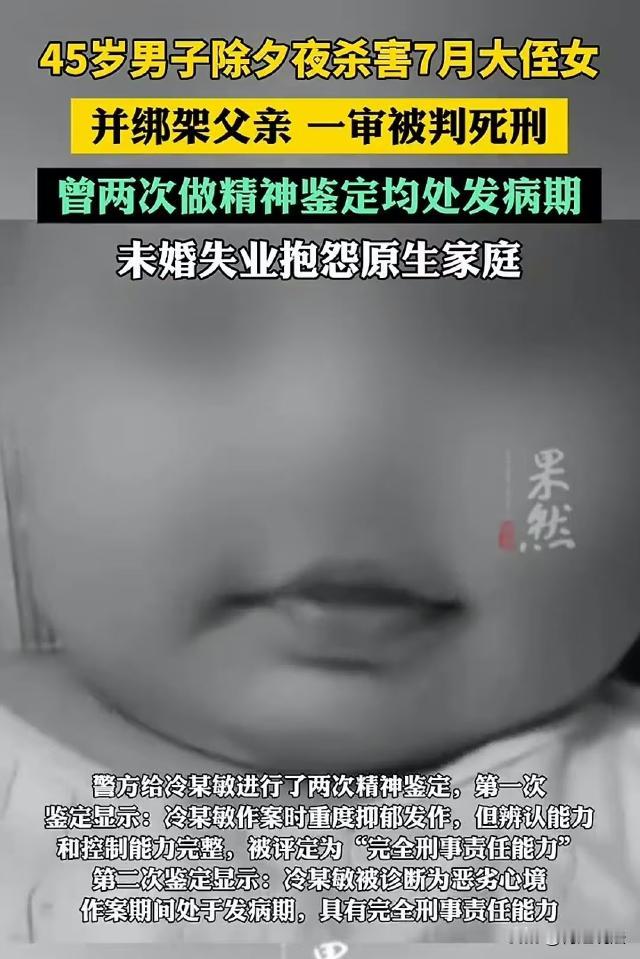 广东惠州,45岁男子因工作和生活受挫,长期情绪低落,遂产生自杀念头。大年30晚上男子杀了7个月大的侄女,又挟持父亲做人质,想让民警将他击毙。近日,本案迎来一审判决。 据齐鲁壹点报道,冷某是1998年的中专毕业生,在那个年代,冷某的起点实际上并不算低。 可是,不知是时运不济还是怎么回事,冷某毕业后在多个大城市打拼多年,却一事无成。 在深圳打工期间,2013年,冷某曾经向弟弟借了3万元创业,可这次创业一点水花都没能激起,后来,冷某又向弟弟借了3万炒股,依然是以赔本告终。并且,这6万元,直到案发都没有还给弟弟。 冷某越混越差,最后只能送快递,甚至直到43岁了,连个女朋友都没有。 因为工作和生活长期受挫,冷某深受打击,性格越来越孤僻内向,也不愿意和家人多接触。 冷某的父母和姐姐住在一起,2025年1月28日是除夕夜,冷某的弟弟带着老婆和一儿一女去姐姐家吃年夜饭。 冷某一个人独居,弟弟和姐姐便去冷某的家里,想给他换一套新被褥,再接他到姐姐家里一起过年。 当时,冷某死活不愿意去,弟弟和姐姐只好离开了,可二人离开后,冷某又自己骑着电瓶车去了姐姐家。 看到大儿子来了,冷某的父母很高兴,当天晚上,一家人团团圆圆吃了顿年夜饭,冷某还给孩子们一人包了一个100元的红包。 饭后,冷某3岁的小侄子闹着要回家,父母稀罕弟弟家7个月的女儿,便留下小孙女一起睡。 于是,冷某弟弟带着弟媳和侄子离开了,而据冷某弟弟事后说,他们回家是因为3岁儿子说,不喜欢和伯伯待在一起。 弟弟一家三口走后,时间逐渐来到了凌晨,冷某的母亲去厨房煮宵夜,冷某来到7个月小侄女睡觉的房间,用被子捂住她的口鼻。 孩子大哭着挣扎起来,母亲发现后过来阻止冷某,冷某从口袋掏出一早准备好的水果刀划伤母亲的手,并将她推出房间,反锁上房门,随后返回房间用水果刀捅扎、划割侄女的脖子,直到确认她死 亡才松开手。 冷某的父亲被哭闹声吵醒后,从房间走到客厅查看,冷某用水果刀将他劫持到了阳台上。 冷某的母亲赶紧下楼寻求帮助,凌晨1点42分,民警破门而入,冷某左手勒住父亲的脖子,右手持水果刀对准他的脖子,拒绝民警进来查看侄女的情况,并多次要求民警将他击 毙。 双方一直僵持到了凌晨3点左右,民警见劝说不下,便朝冷某头顶上方开了一枪,冷某倒地,民警趁机将他制服,并解救下其父亲,进屋查看小侄女的情况,但遗憾的是,孩子早已气绝多时。 案发后,冷某交代,他因工作生活受挫,产生了自杀的念头。 案发当天,冷某留宿姐姐家时,产生了杀 害杀害侄女,然后劫持人质,从而被民警击毙的念头,并实施了上述一切。 案发后,冷某做了两次精神鉴定,第一次显示他有抑郁症,第二次鉴定为恶劣心境,但案发时均具有完全刑事责任能力。 12月23日下午,本案迎来一审判决。 1、一审认为,冷某构成故意杀 人罪。 《刑法》第二百三十二条规定,故意杀 人的,处死刑、无期徒刑或者十年以上有期徒刑;情节较轻的,处三年以上十年以下有期徒刑。 冷某因工作和生活长期受挫产生自杀念头,进而产生杀害侄女然后被民警击毙的想法,具有非法剥夺他人生命的故意,并最终导致侄女死 亡。 因此,冷某的行为构成故意杀 人罪,且情节恶劣。 2、冷某还构成绑架罪。 根据《刑法》第二百三十九条规定,以勒索财物为目的绑架他人的,或者绑架他人作为人质的,处十年以上有期徒刑或者无期徒刑,并处罚金或者没收财产;情节较轻的,处五年以上十年以下有期徒刑,并处罚金。 冷某杀 害侄女后,用水果刀将父亲劫持到阳台上,左手勒住父亲脖子,右手持水果刀对准其脖子,拒绝民警查看侄女情况,并多次要求民警将他击毙,符合绑架他人作为人质的情形。 冷某劫持父亲并非以勒索财物为目的,但其通过控制父亲的人身自由,以此对抗民警,达到让民警击毙自己的目的,这属于绑架他人作为人质的行为。 3、冷某犯故意杀 人罪和绑架罪,应数罪并罚。 《刑法》第六十九条规定,判决宣告以前一人犯数罪的,除判处死刑和无期徒刑的以外,应当在总和刑期以下、数刑中最高刑期以上,酌情决定执行的刑期。 冷某产生杀害侄女的想法后,提前准备作案工具,属于有预谋的作案。 并且,冷某同时触犯故意杀 人罪和绑架罪,应当数罪并罚。 最终,一审判冷某犯故意杀 人罪,判处其死刑,剥夺政治权利终身。判冷某犯绑架罪,判处有期徒刑七年,并处罚金二万元。 因冷某主观恶性较大、犯罪情节恶劣,且造成了恶劣的社会影响,决定对冷某执行死刑,剥夺政治权利终身,并处罚金二万元。