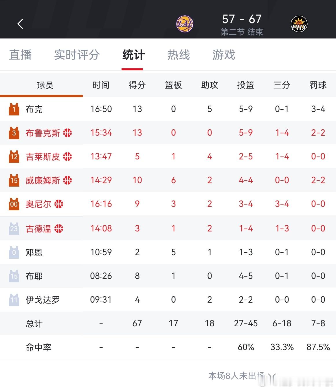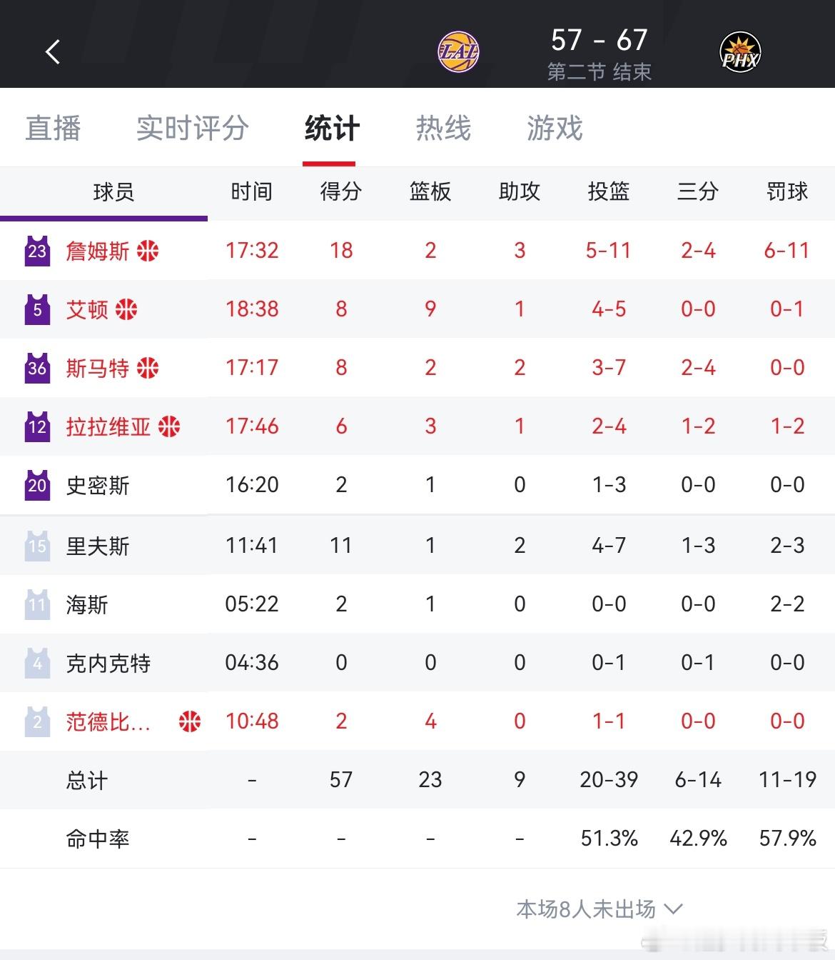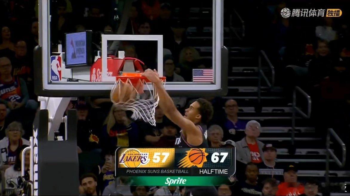 半场结束,湖人57-67落后太阳湖人vs太阳